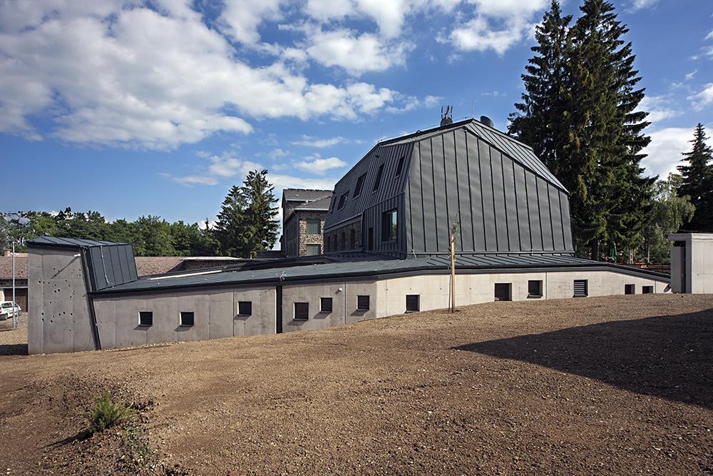 A tetőzet törtvonalú íve képes bekapcsolni a kompozícióba azt a két új épületszárnyat is, ami udvart formálva fordul az erdő felé. Az úthoz – a Nagyszállóhoz – közelebbi szárny kerékpáralkatrész-boltot, udvari oldalán kerékpármosót, kerékpártárolót tartalmaz, míg az épületkaréj fák felőli szárnyának végén, izgalmas tetőkiszögelés alatt, amolyan csendes helyiség, zarándokfülke található. Falában jelleg-zetes, csillagképekből szerkesztett bevilágító lyukak láthatóak. Noha ezek az épületszárnyak látszóbetonból készültek, arányaik, vonalvezetésük, méretük okán kitűnően illeszkednek a régi felépítményhez, a természeti környezethez egyaránt. Semmi bunkerszerűség, semmi erőszak a természeten.