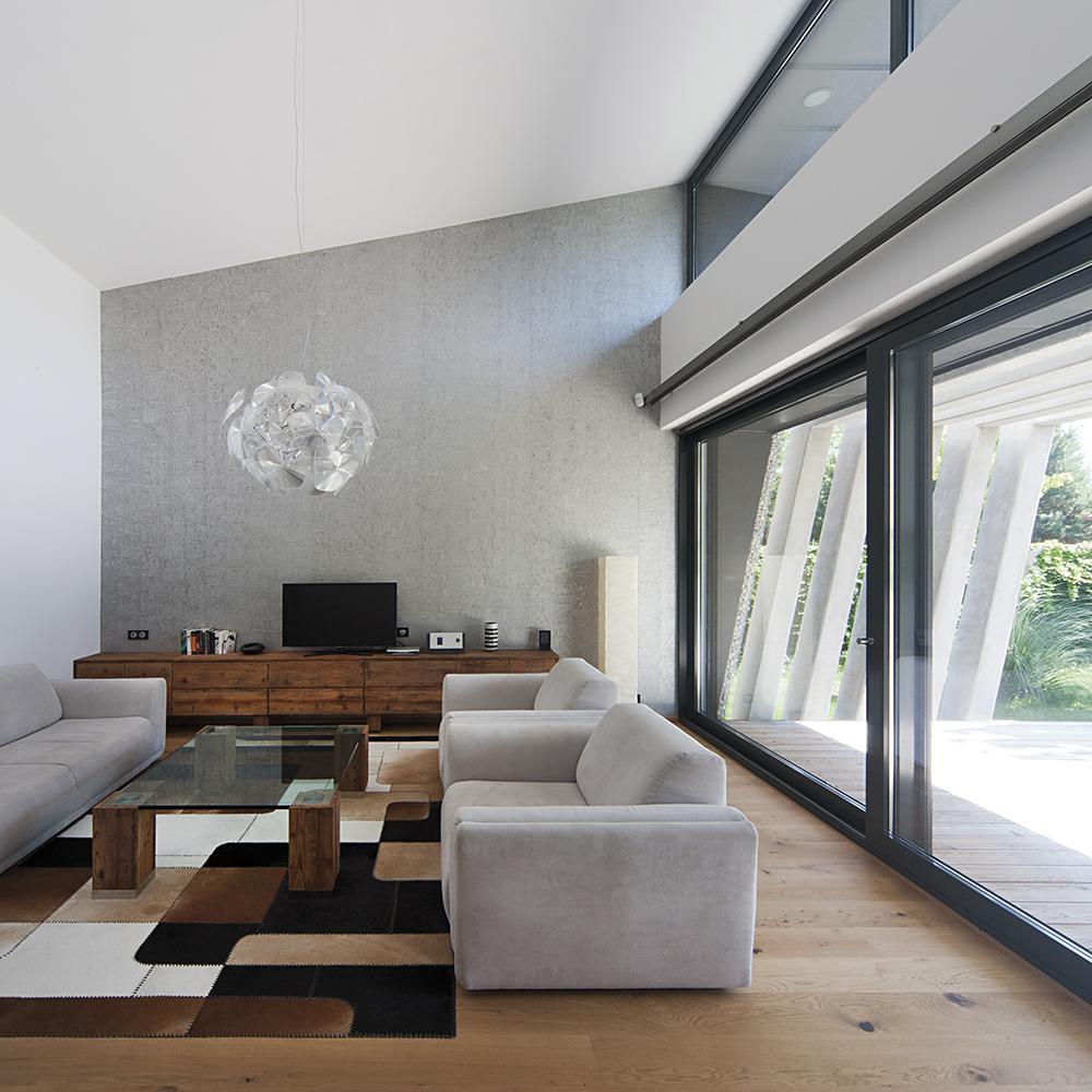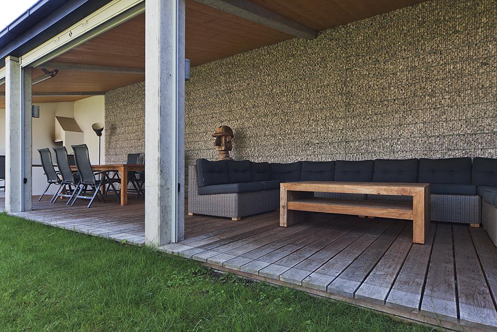 A nappalit és a megemelt teraszt a high-tech ízű pergola árnyékolja le, látszóbeton gerendáit – szögtöréseiket, a gerendái közötti távolságot – a napjárásnak megfelelően helyezték el. Szemben a déli homlokzattal, a telek teljes szélességében, egyúttal a kert lezárásaként egy tárolóval, nyári konyhával kapcsolt külső terasz áll, hátsó falán megismétlődik az épület gabion-hálós burko-lata, amely fal a vasút felé zajvédő falként is szolgál. Ez az egységesítő, zárt kompozíciót létrehozó gesztus ismerős lehet olvasóink számára, hiszen az építész a korábbi, eltérő építészeti világú, Balatonszepezdre tervezett családi háza (OCTOGON 2013/5) esetében is hasonlóan gondosan járt el.