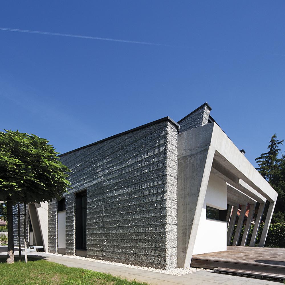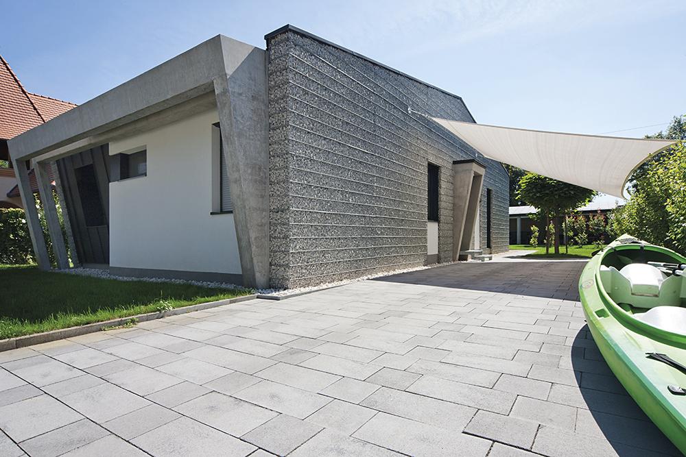 Ez a ház önmagában is feltűnő, de a környező téglafalú, hol tornyos, hol nyeregtetős házak szomszédságában mindenképpen túlhajtottnak tűnhetnek a látszóbeton árnyékolók, előtető, a vakolt falrészekkel váltakozó, önálló rácsszelvényekből felépített külső gabionhomlokzatok. Feltűnő, mégsem látványépítészetet szemlélünk. Mint lényegében minden Paládi-Kovács épületnél, a belső funkciók, igények lekövethetőek a külsőn is. Például a déli (kerti) homlokzat sarokablakos fala mögött a konyhapult szalad végig, a magasított, teli-ablakos oldal a belső tér „szívét”, a nappalit vezeti be.