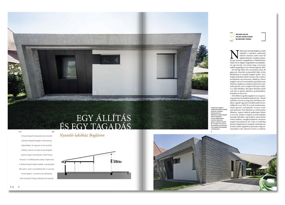 Erős állítás és egyben tagadás is ez az egyszerű geometriai formákból építkező ház. Annak tudatában írom le ezt, hogy már első látásra tisztában vagyok/vagyunk a tömbformálás forrásvidékével: ez az 1920-30-as évek modernizmusának egyterű, racionalizált, teraszos weekend-építészete. Nem titkoltan ez, a helyszínhez (Balaton, tópart) adekvát épülettípus ihlette a tervezőt, amikor a boglári nyaraló-lakóház formáját definiálta. Ugyanakkor amint letette voksát mellette, anyaghasználatával, merészen megtört kontúrjaival túl is lép az eredetileg könnyű felépítményű, kompakt archetípuson. Ennek az állító-tagadó koncepciónak a végeredményeként a ház sikeresen ötvözi az urbánus lakóház óvó-védő, állandóságot és biztonságot sugárzó jellegét a tájra, a környezetre nyitottabb, „hajlékonyabb” nyaraló-karakterrel. Érthető, hogy egy ilyen épületnek a szomszédos házakkal való kapcsolata nehézkes: az épület tudatosan nem akar beilleszkedni az egységesnek nem mondható arhitekturális környezetbe, inkább lehetséges új választ szeretne adni a kortárs építészet eszközeivel.