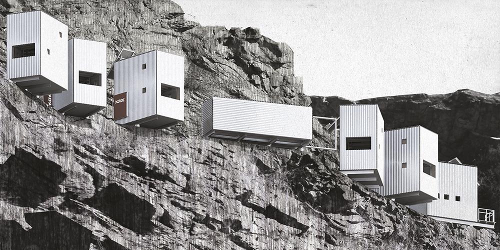 A 30 méter magas andezit sziklafalak között sok kicsi tömeg karmol bele a katlan teraszaiba. Formailag a kubusok földön lévő része ugyanúgy viselkedik, mint a levegőben lévő, ezzel is erősítve a konzolosság erejét. Az épülettömegek egyéni karakterükkel fejezik ki a környezet szellemiségét, előregyártott csarnokszerkezettel, nyers részlet- és felületképzéssel utalnak a kőfejtő ipari múltjára. Látványát tekintve a bányagödör változó domborzati képe izgalmas téri helyzetbe hozza a kubusokat, mintegy meghatározott ritmikát teremtve így tömeg és természet között.