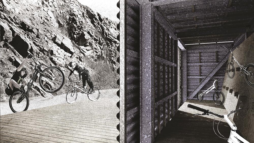 A triál és az edzés alapja a szikla. Magyarország sziklákban szegény ország, azonban a tarcali kőfejtő különleges természeti adottságait már az első generációs triálosok is felfedezték. Egyedi struktúrájának köszönhetően az idők során nemzetközileg is kuriózumnak számító hely lett, 2000 óta pedig rendszeresen rendeznek versenyeket itt. Az utóbbi években nem csak a gyártási technológia és a kerékpárok geometriája fejlődött gyors ütemben, hanem maguk a gyakorlatok is. Versenyszituációban például egyre gyakrabban fordulnak elő olyan helyzetek, amit csak tökéletes technikával lehet teljesíteni. Ez extrém koncentrációt igényel, hiszen el kell találni azt a pontot ahonnan a lendület leginkább továbbvihető és az egyensúlyi helyzet tartható. Egy szépen teljesített ugrást nüánsz választ el az eséstől. A triálban egyébként minden technika a súlypont hirtelen áthelyezésére és az egyensúlyra épül, így az épületek telepítése és tömegalakítása is lényegében erre az alapfilozófiára reflektál.