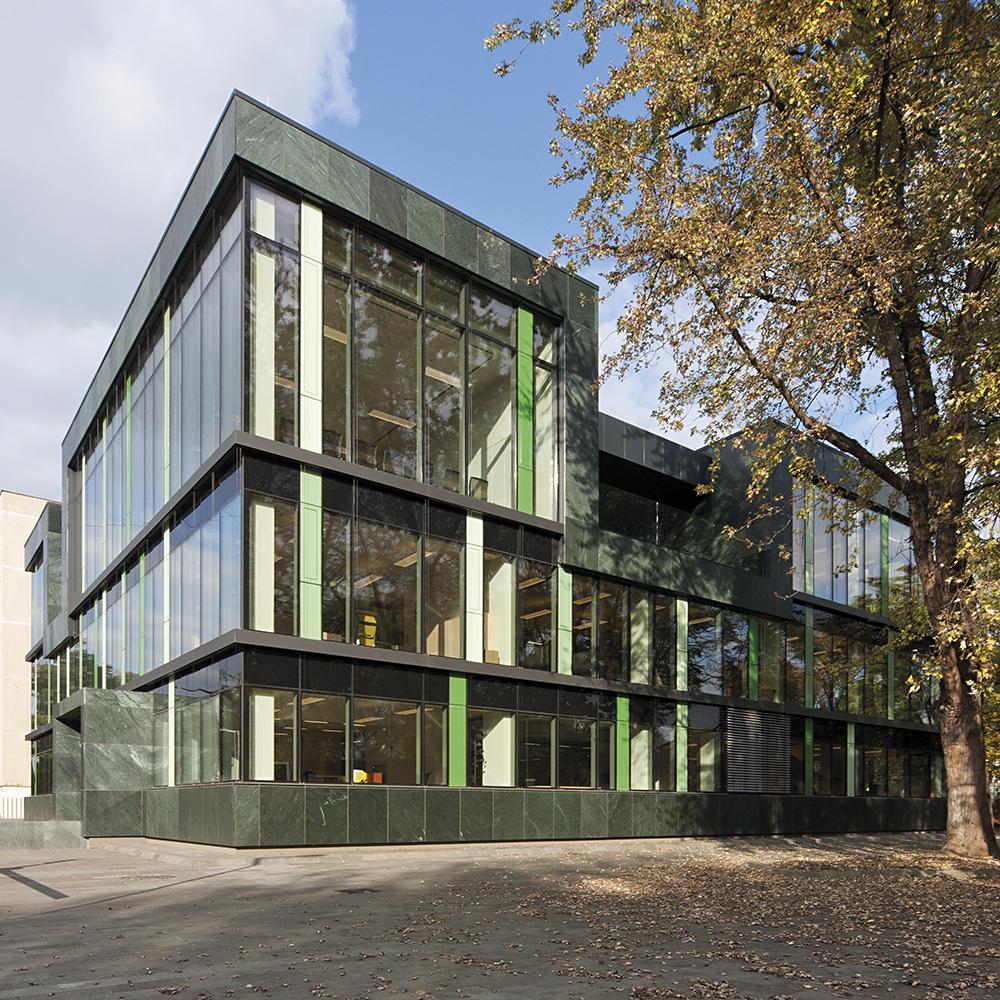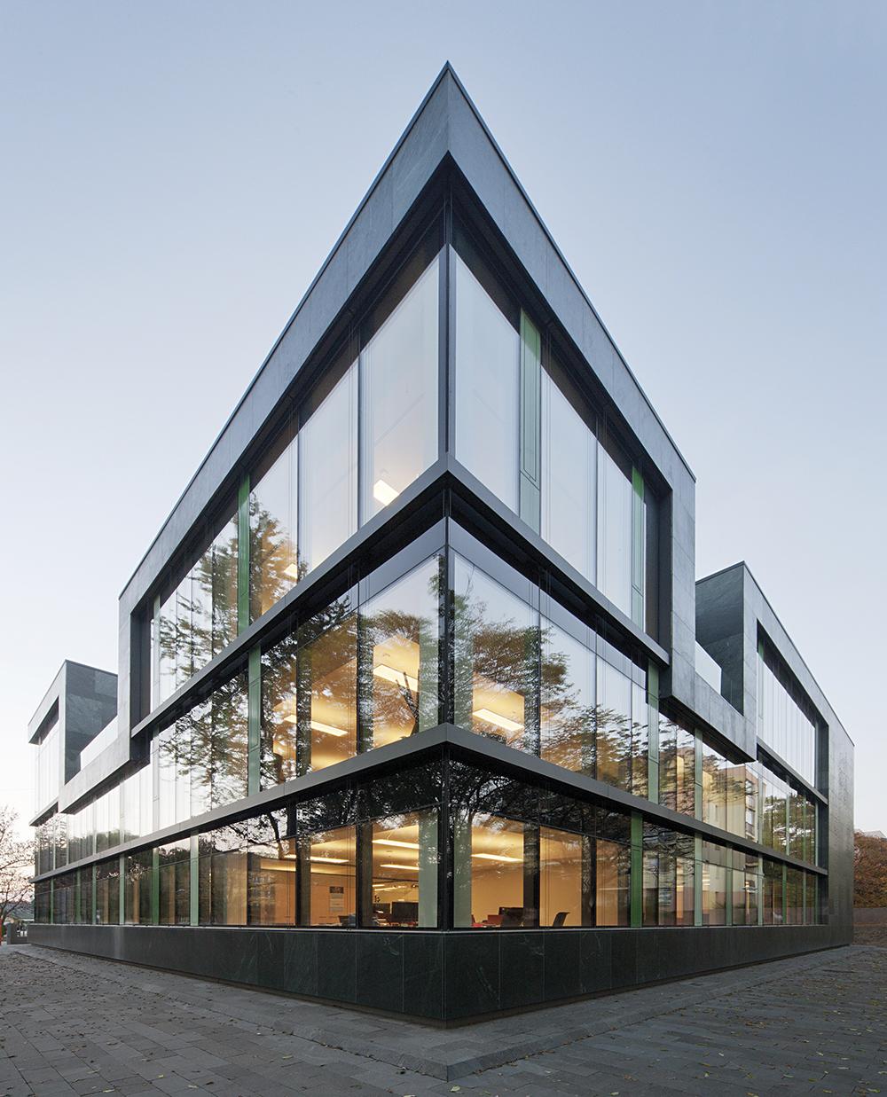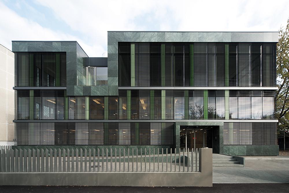 A belső fényből értjük meg azt is, hogy miért is áll olyan jól ennek az épületnek a „mocsárzöld” kőburkolat és a speciális öntisztuló bevonattal ellátott, háromféle szürkeezüst színű külső árnyékoló, amit egyébként, noha automatika vezérel, de az egyes irodákból ki-ki az igényeihez alakítva nyithat, vagy zárhat. Ez a színezés és ez a nagyvonalú anyaghasználat ugyanis amellett, hogy jól kezeli a környezet szürkeségét, masszív, anyagszerű külső megjelenést is sugall, ami szép ellenpontja a belső tér anyagtalanságának. Kitűnő építészeti fogás, ahogyan a harmadik, vagyis az acélvázakkal az épületre épített színt belmagassága épp annyival növekszik, hogy az még ne okozzon tömeg-ritmikai problémákat. Ráadásul a legfölső szint „húsosságát” finoman „faragja vissza” az a négy terasz, ami egyébként ugyancsak fényszivattyúként is funkcionál.