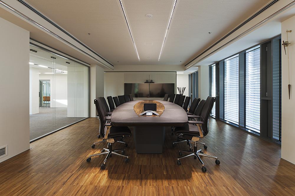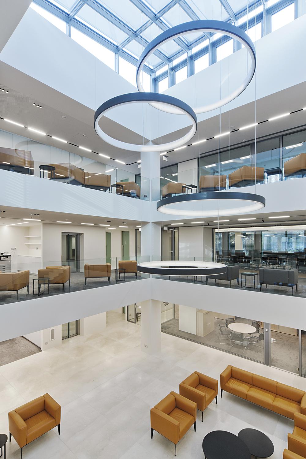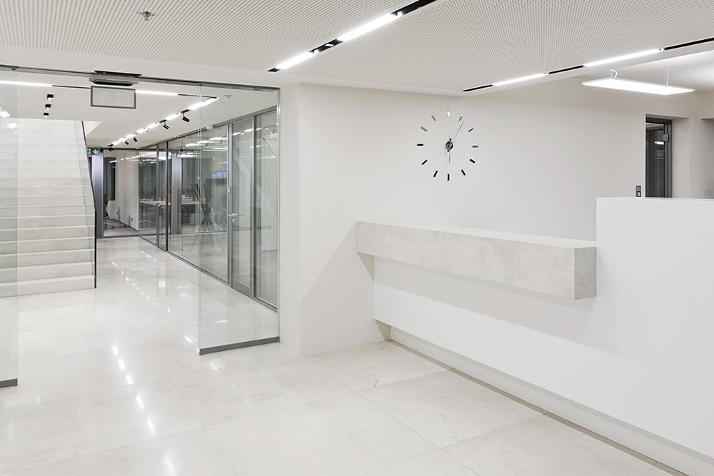 A városi környezet szürke derengéséből belépve a hófehér recepció terébe, majd tovább menve a földszinten olyan érzésünk van, mintha nem is belső, határolt térben járnánk, hanem valamiféle „asztráltestben”. Noha ott jártunkkor lapos szögben, fáradtan, a felhők közül imitt-amott kikandikálva sütött az őszi nap, mégis olyan fényélményben volt részünk, ami rendkívüli az irodaház műfajában. Tévedés ne essék, nem orvosi sterilitásról, minimalista designról beszélünk, üres fehér síkokkal derített terekről, hanem a belső téri adottságok helyes és világszínvonalú építészeti átértelmezéséről. Lenyűgözött, ahogyan a bútorok, az ablakok lamelláinak megnyúlt árnyékai finoman végigsimították a belső teret. Hétvége volt. Az iroda szinte üres. Készítettem néhány fekete-fehér felvételt, mert az árnyékok mintha egy régi film noir díszletbe repítettek volna. Amit azon a délutánon a fény és az épület „művelt” egymással az képzőművészeti magasságokban járt.