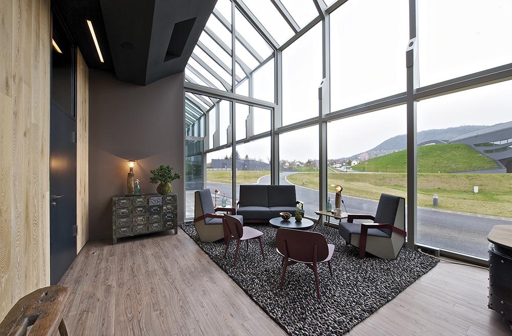 A vintage elemekből, a borászat kisüzemi világához illő indusztriális alkatrészekből összeszerelt recepciós és kiszol-gálópult, a skandinávosan elegáns, szürke-bordó színezésű leülő-sarkok, hosszú étkezőasztalok, faszékek – egy sor olyan részletből állnak össze, amit kedvtelve azonosít és fürkész a szem. Az absztrakt építészeti mindenség után egyfajta játékosan kreatív, ugyanakkor a vidéki élet formakincsét is megjelenítő berendezésről van itt szó, ahol egészen meglepő tárgytársítások fedezhetőek fel. Így nem meglepő, hogy az antik tornatermi lóból asztal lesz, a kisebb asztalokon feltűnnek a kis pincészetek préseinek menetesszárai. A tervezési koncepció szempontjából az egyik fontos elem volt a szürkeség gondolata, illetve a játék a homogenitással. A bazaltszürke előterében az ember, a vendég válik „színné”.