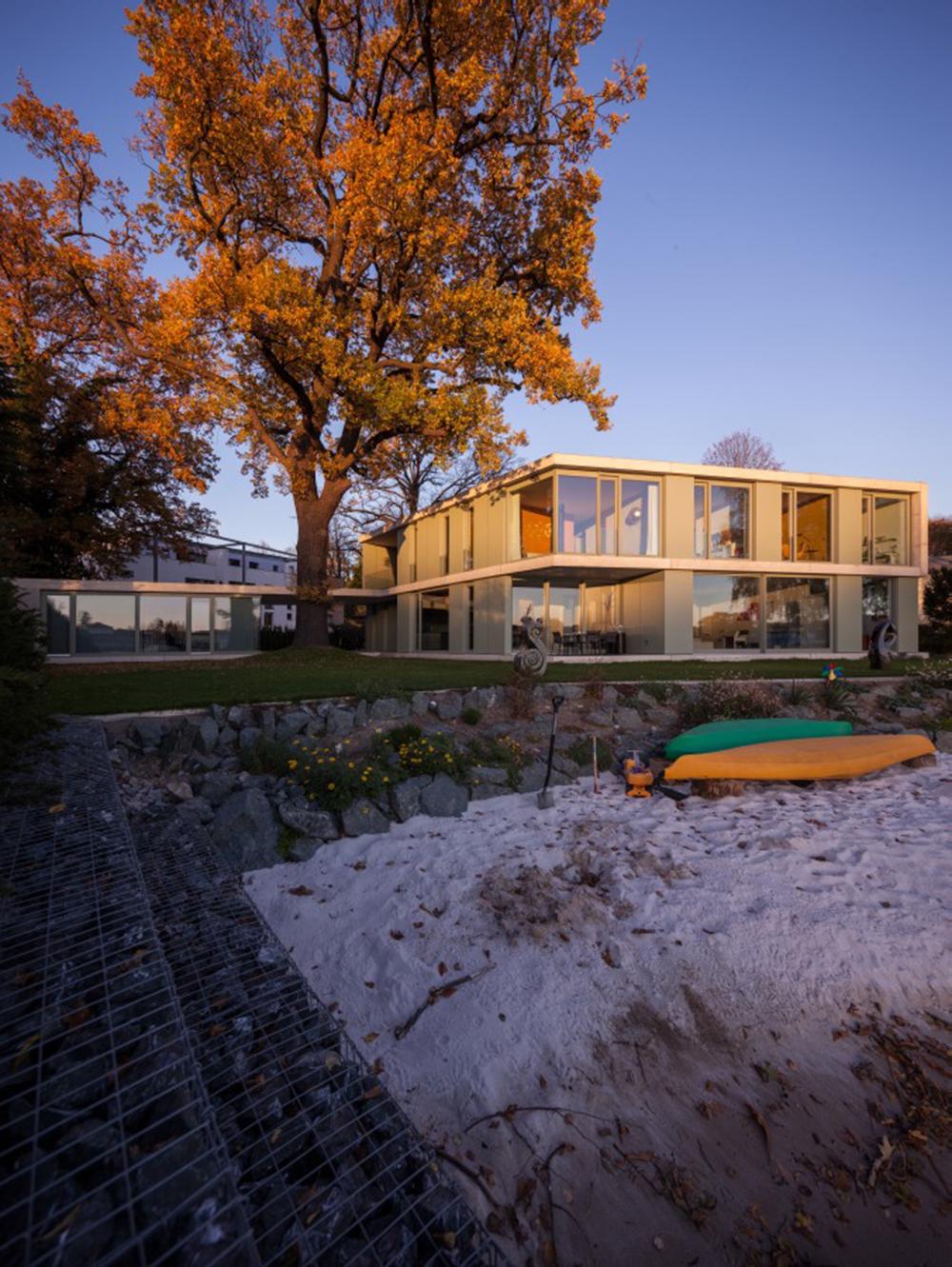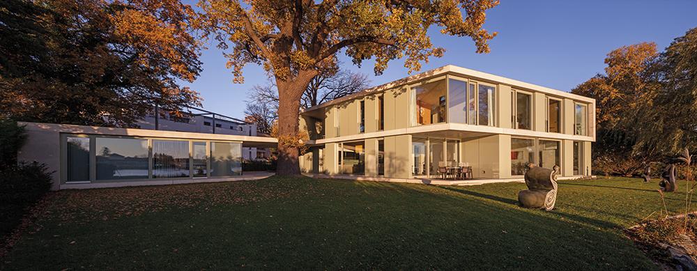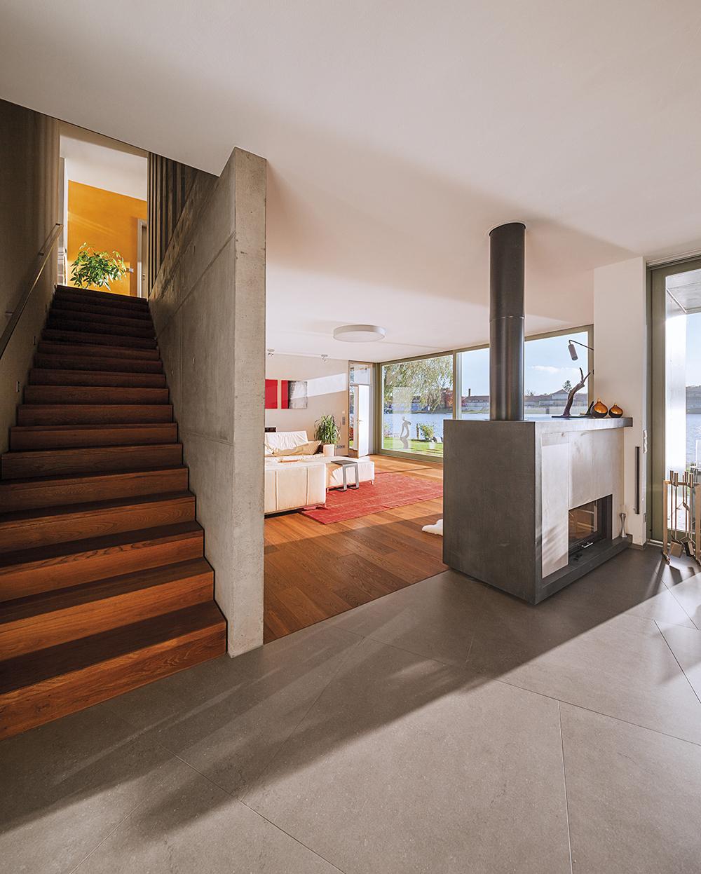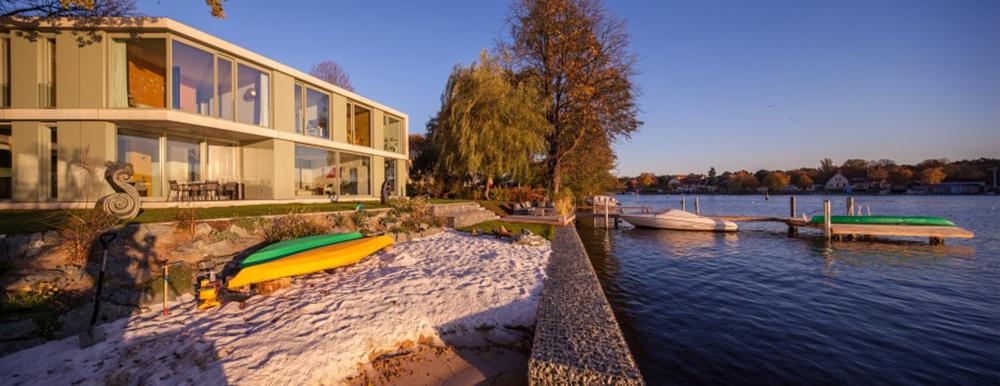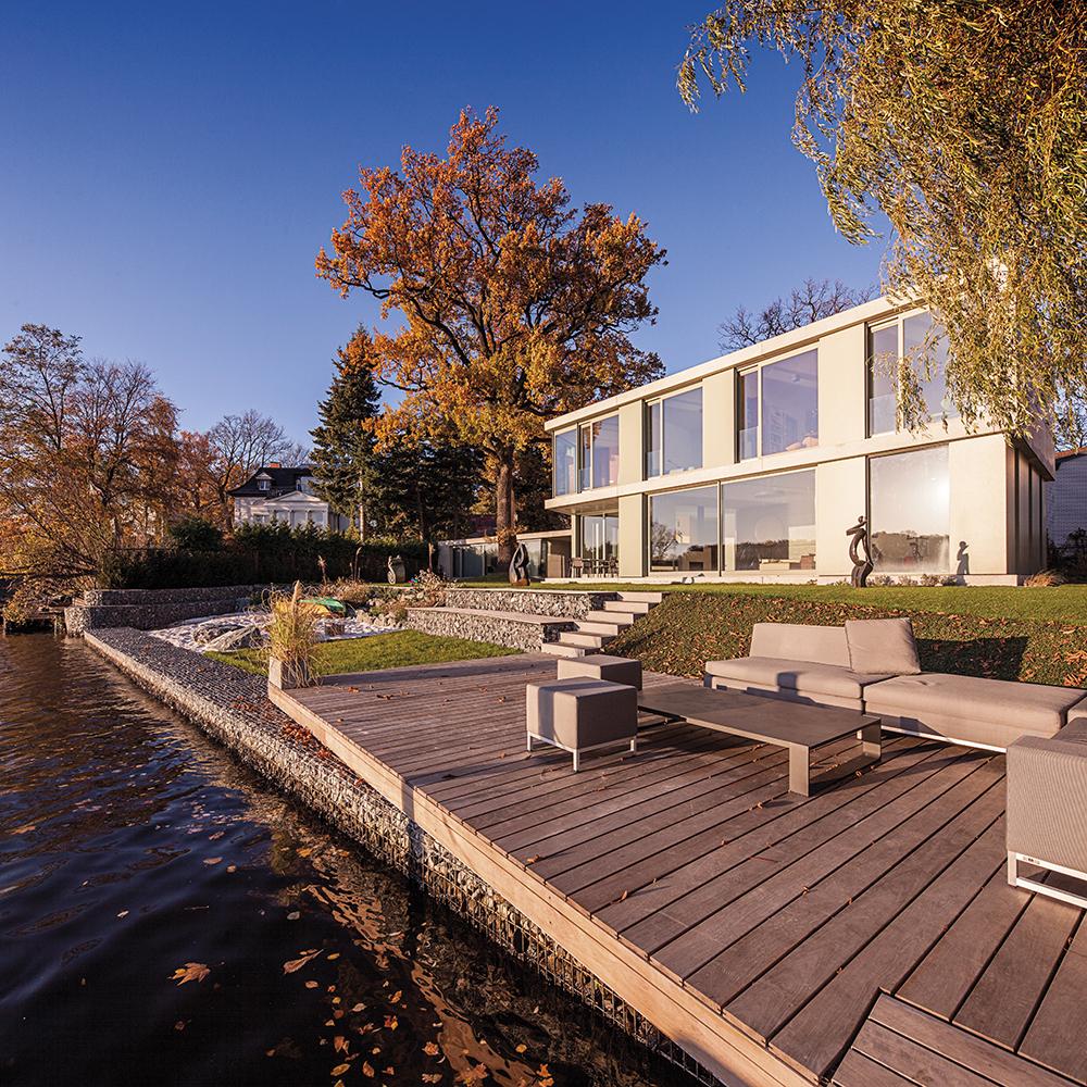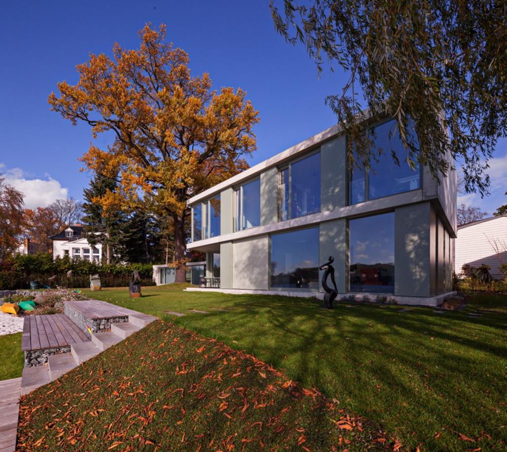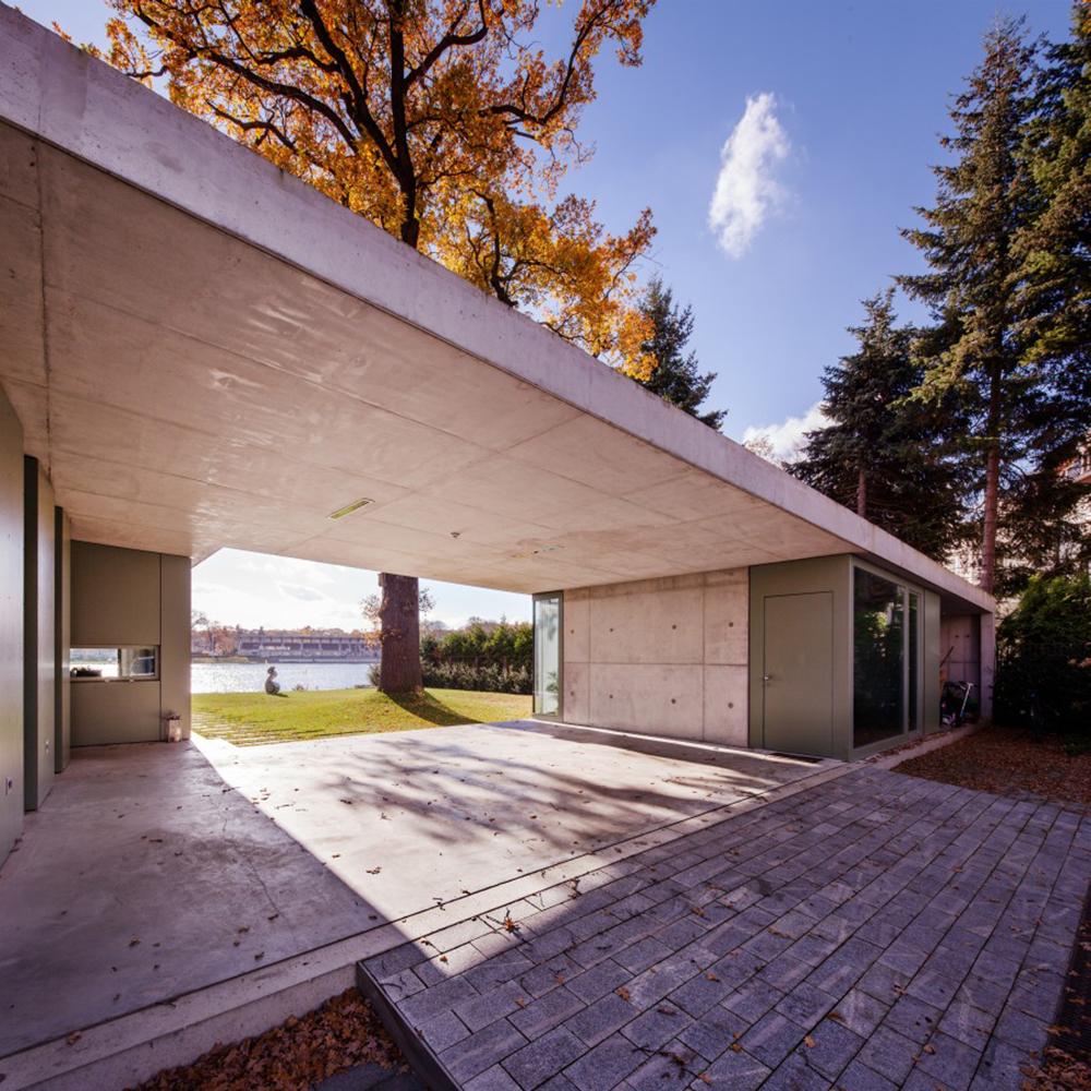 Rátérve a két konkrét projektre, a vízparti ház, vagyis Klaus-háza esetében a megbízó maga is ingatlanfejlesztő, akinek kitartó munkával kellett összesen húsz tulajdonostól a különféle telekrészeket megvásárolnia. Számára Ambrus tervezett már egy házat, de annak a telkét végül eladta, abból nem lett építés. A vízpart-szituáció mellett meghatározó volt a hatalmas tölgyfa pozíciója, mert azt mindenképpen a kompozíció részévé kívánták tenni. Így a kalapács-formájú telek közepén álló százéves, szoborszerű fa köré feszül ki az épület. Egy beton sík szervezi a tömegeket, ami alatt a parkoló, illetve az önálló irodai rész szintén kapcsolódik a főtömeghez. Természetesen az épület gépészete a komplex és szigorú előírások-nak, szabályrendszernek megfelelően a lehető legalacsonyabb energiaigénnyel rendelkezik.