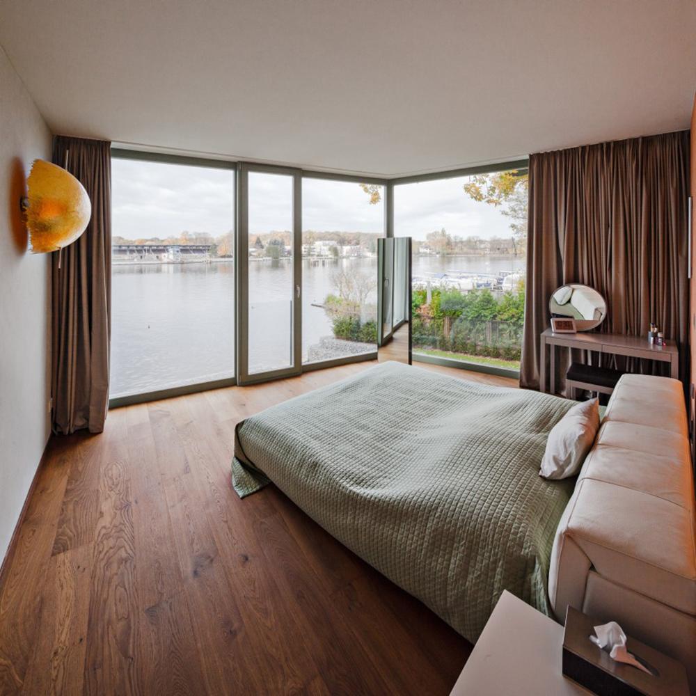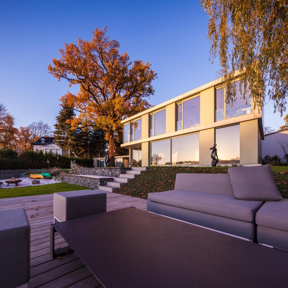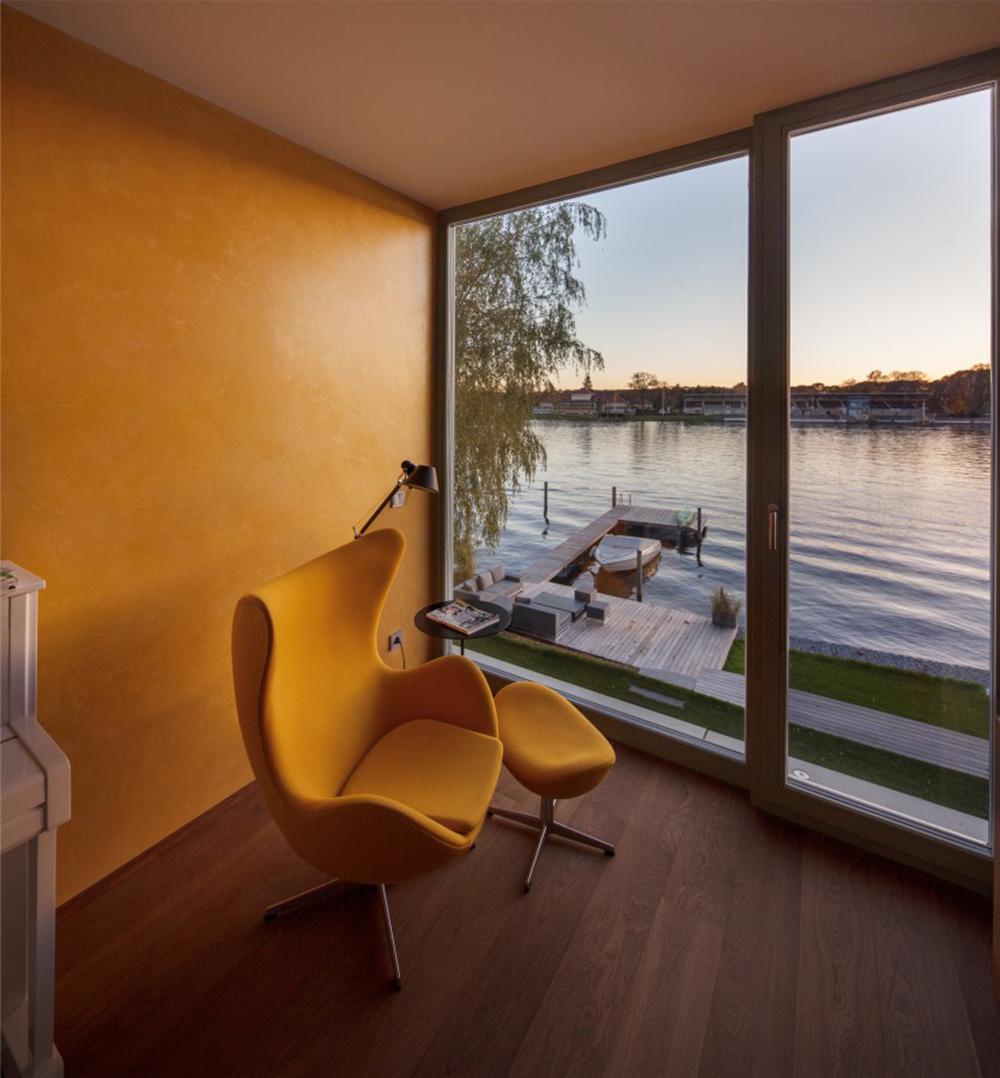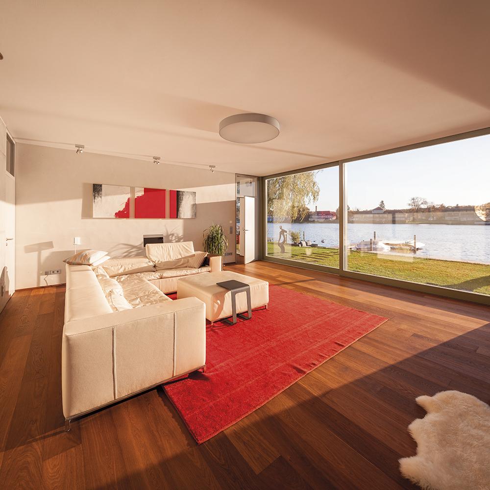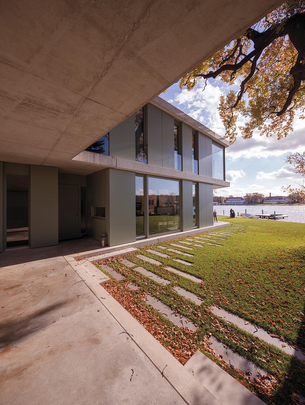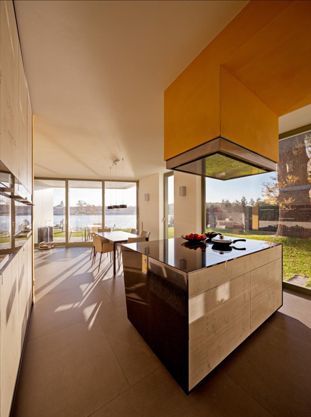 Rátérve a két konkrét projektre, a vízparti ház, vagyis Klaus-háza esetében a megbízó maga is ingatlanfejlesztő, akinek kitartó munkával kellett összesen húsz tulajdonostól a különféle telekrészeket megvásárolnia. Számára Ambrus tervezett már egy házat, de annak a telkét végül eladta, abból nem lett építés. A vízpart-szituáció mellett meghatározó volt a hatalmas tölgyfa pozíciója, mert azt mindenképpen a kompozíció részévé kívánták tenni. Így a kalapács-formájú telek közepén álló százéves, szoborszerű fa köré feszül ki az épület. Egy beton sík szervezi a tömegeket, ami alatt a parkoló, illetve az önálló irodai rész szintén kapcsolódik a főtömeghez. Természetesen az épület gépészete a komplex és szigorú előírások-nak, szabályrendszernek megfelelően a lehető legalacsonyabb energiaigénnyel rendelkezik.