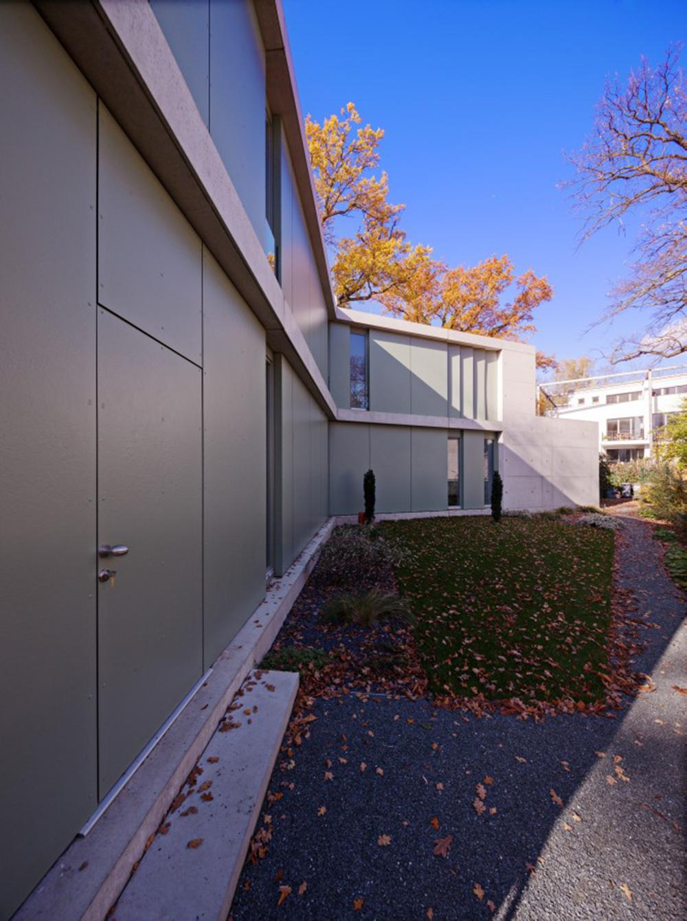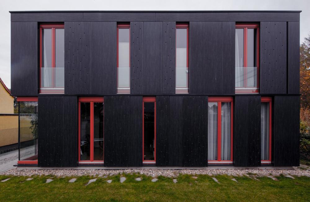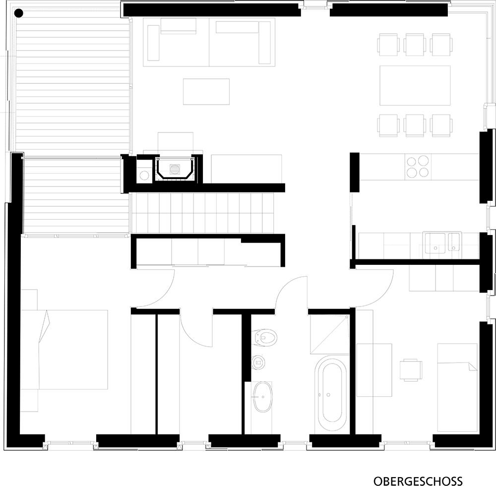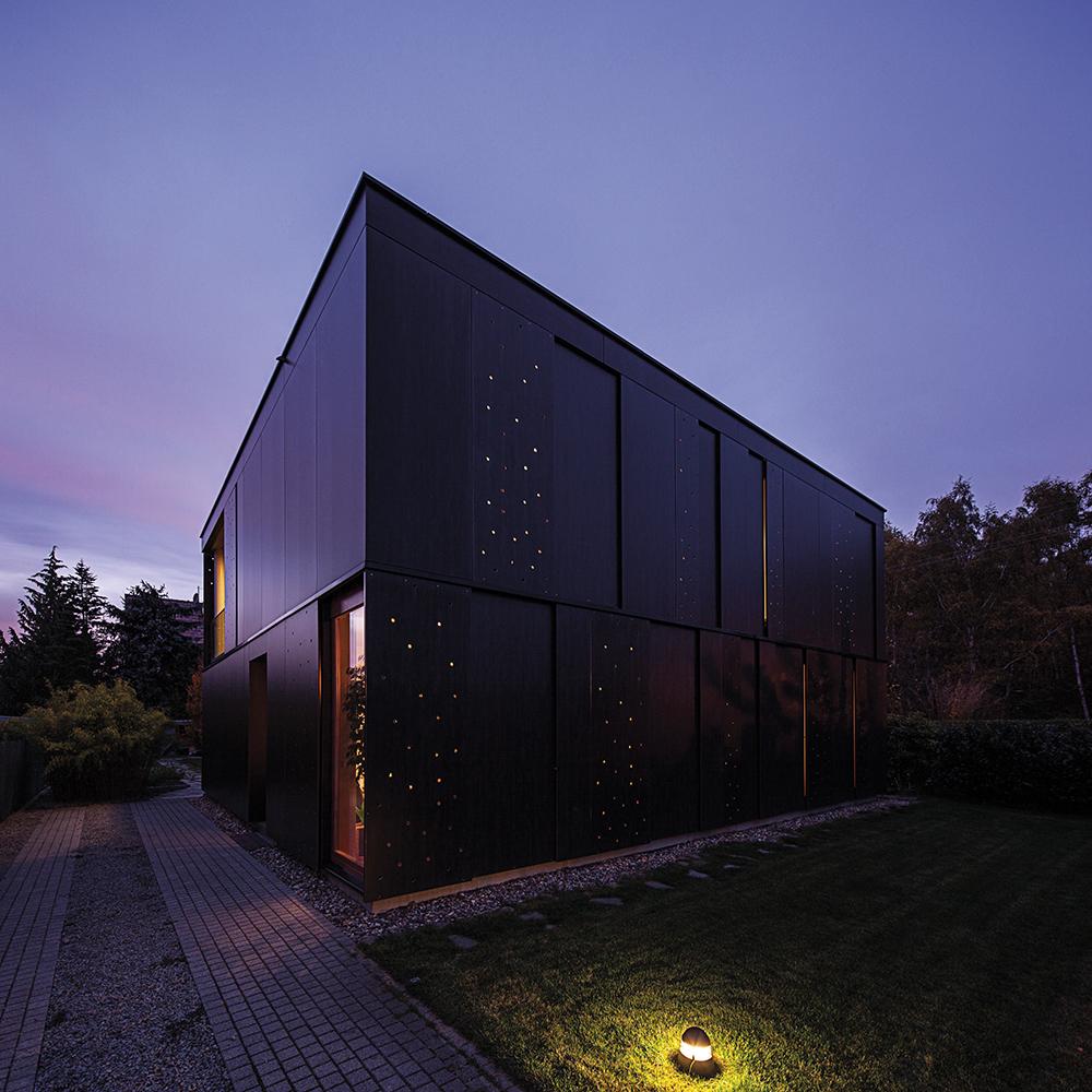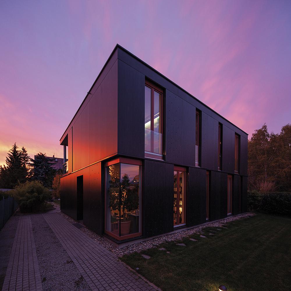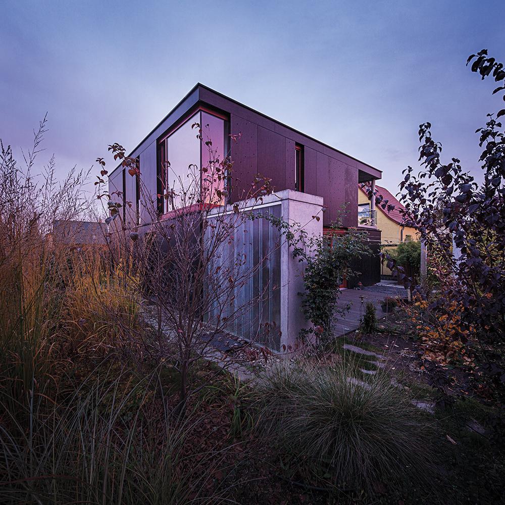 Idézzünk az építészeti műleírásból: „A kompakt fekete tömb két funkcionális egysége a belső struktúrából nyeri el identitását: a délután besütő napra és a kertre fordul a földszinti lakás. Ez a kert a tágas teraszhoz kapcsolódva, attól kéznyújtásnyira terül el. Így a szülők bármikor, mindenféle akadály nélkül hódolhatnak szenvedélyüknek, a kertészetnek. A »juniorsuite« az emeleten tálalható. A elkülönített szobákkal szemben egy következetesen strukturált ugyanakkor nyitott alaprajzot részesített előnyben az itt lakó fiatal házaspár. A nagyszabású üvegfelületeken át az évszakok változásával folyton változó, élő »faliképként« költözik be az utca másik oldalán elterülő nyárfaerdő a lakótérben. Mint az évszakok, úgy változnak a hétköznapok téri igényei. Így a strukturálisan formált homlokzatok nem teszik leolvashatóvá az alaprajzot. Az emeletmagas toló-spaletták szükséglet szerinti mozgatásával újra és újra változik az épület megjelenése is. A kubus feketés-erezetes felületével és visszahúzódó megjelenésével nem akar konkurálni inhomogén környezetével. Mint egy hatalmas sötét fahasáb fekszik csöndesen az erdő szélen. Csak a néha előbukkanó korallpiros ablakkeretek sejtetik az eleven, színes magot a fekete héj alatt.”