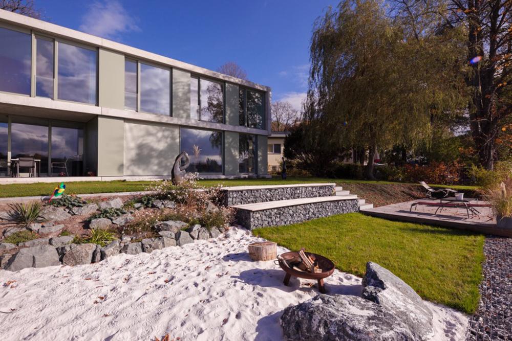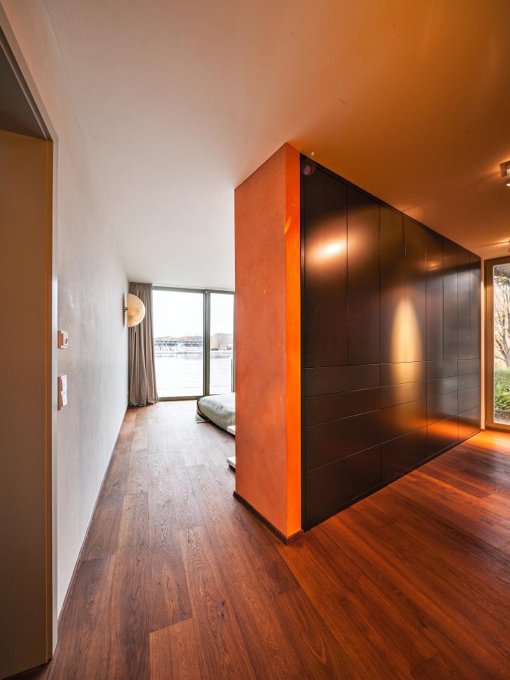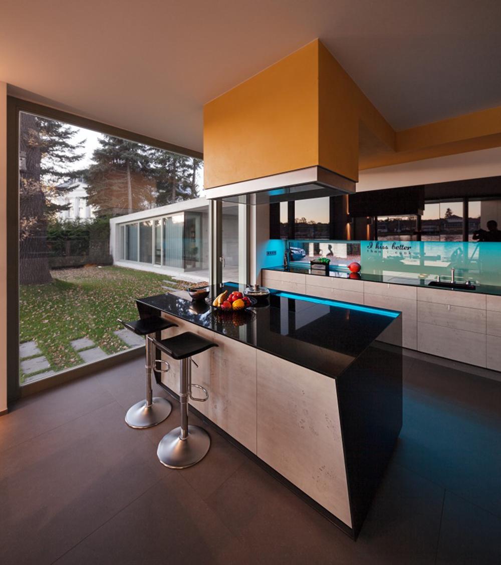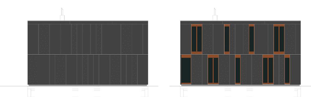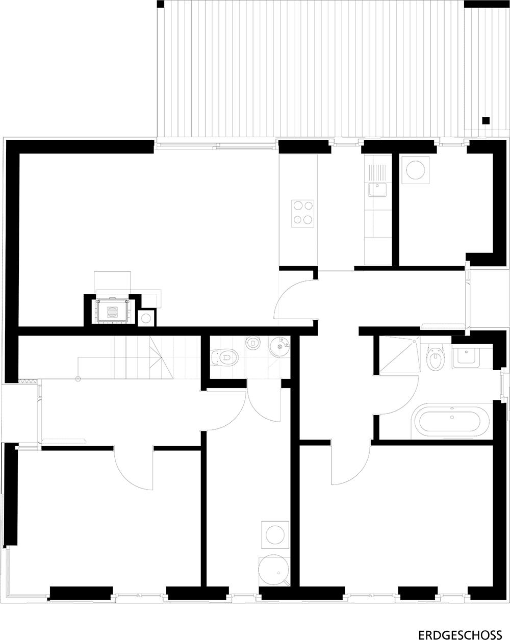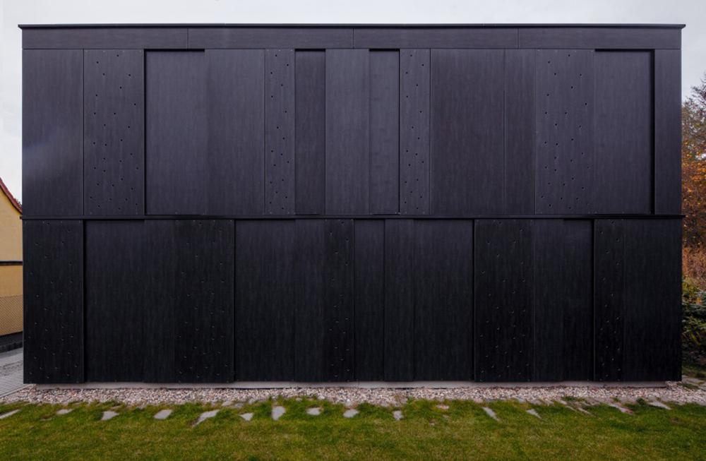 Idézzünk az építészeti műleírásból: „A kompakt fekete tömb két funkcionális egysége a belső struktúrából nyeri el identitását: a délután besütő napra és a kertre fordul a földszinti lakás. Ez a kert a tágas teraszhoz kapcsolódva, attól kéznyújtásnyira terül el. Így a szülők bármikor, mindenféle akadály nélkül hódolhatnak szenvedélyüknek, a kertészetnek. A »juniorsuite« az emeleten tálalható. A elkülönített szobákkal szemben egy következetesen strukturált ugyanakkor nyitott alaprajzot részesített előnyben az itt lakó fiatal házaspár. A nagyszabású üvegfelületeken át az évszakok változásával folyton változó, élő »faliképként« költözik be az utca másik oldalán elterülő nyárfaerdő a lakótérben. Mint az évszakok, úgy változnak a hétköznapok téri igényei. Így a strukturálisan formált homlokzatok nem teszik leolvashatóvá az alaprajzot. Az emeletmagas toló-spaletták szükséglet szerinti mozgatásával újra és újra változik az épület megjelenése is. A kubus feketés-erezetes felületével és visszahúzódó megjelenésével nem akar konkurálni inhomogén környezetével. Mint egy hatalmas sötét fahasáb fekszik csöndesen az erdő szélen. Csak a néha előbukkanó korallpiros ablakkeretek sejtetik az eleven, színes magot a fekete héj alatt.”