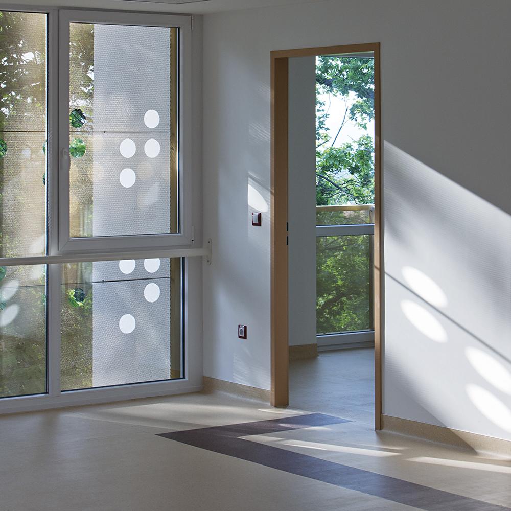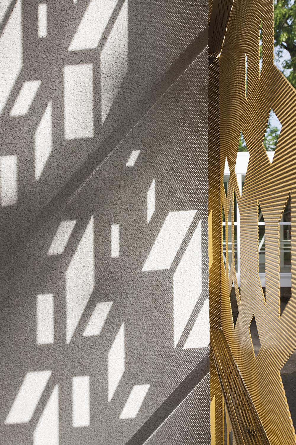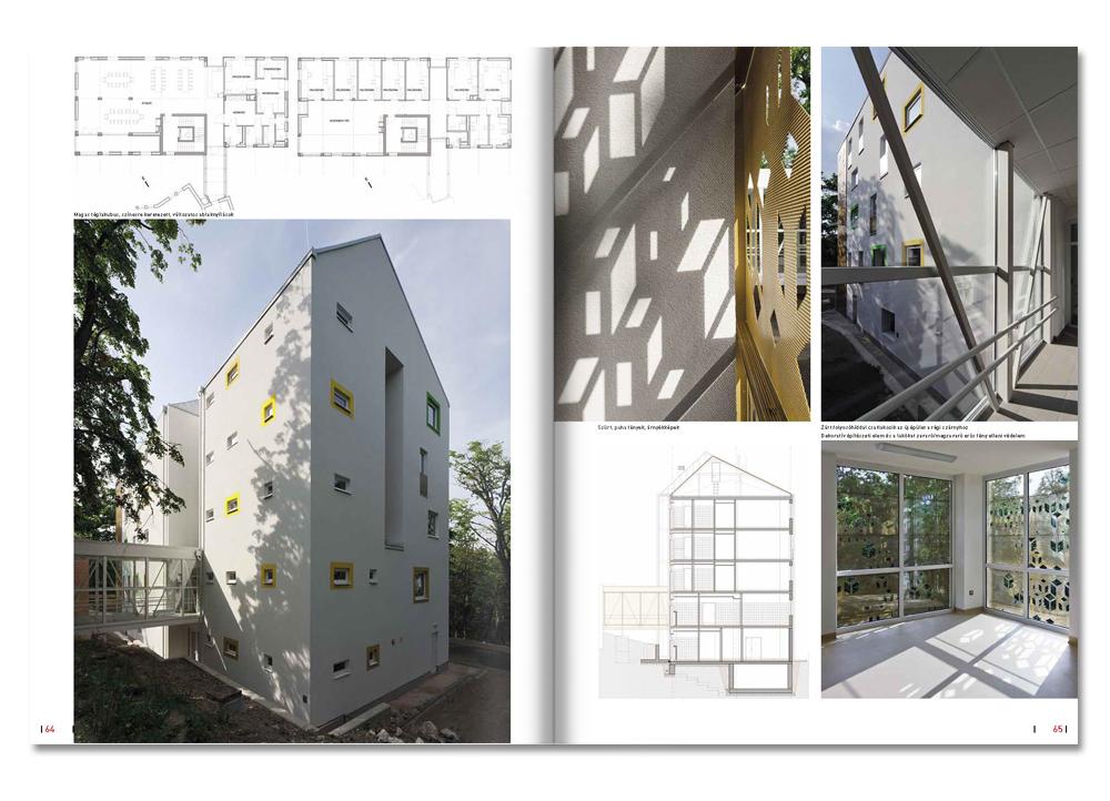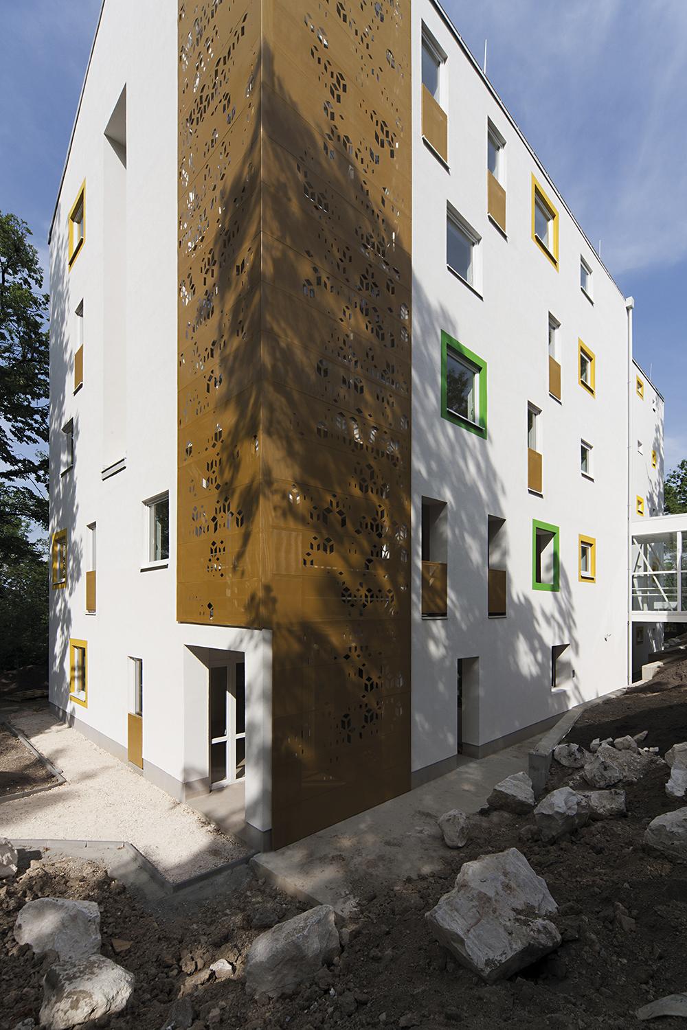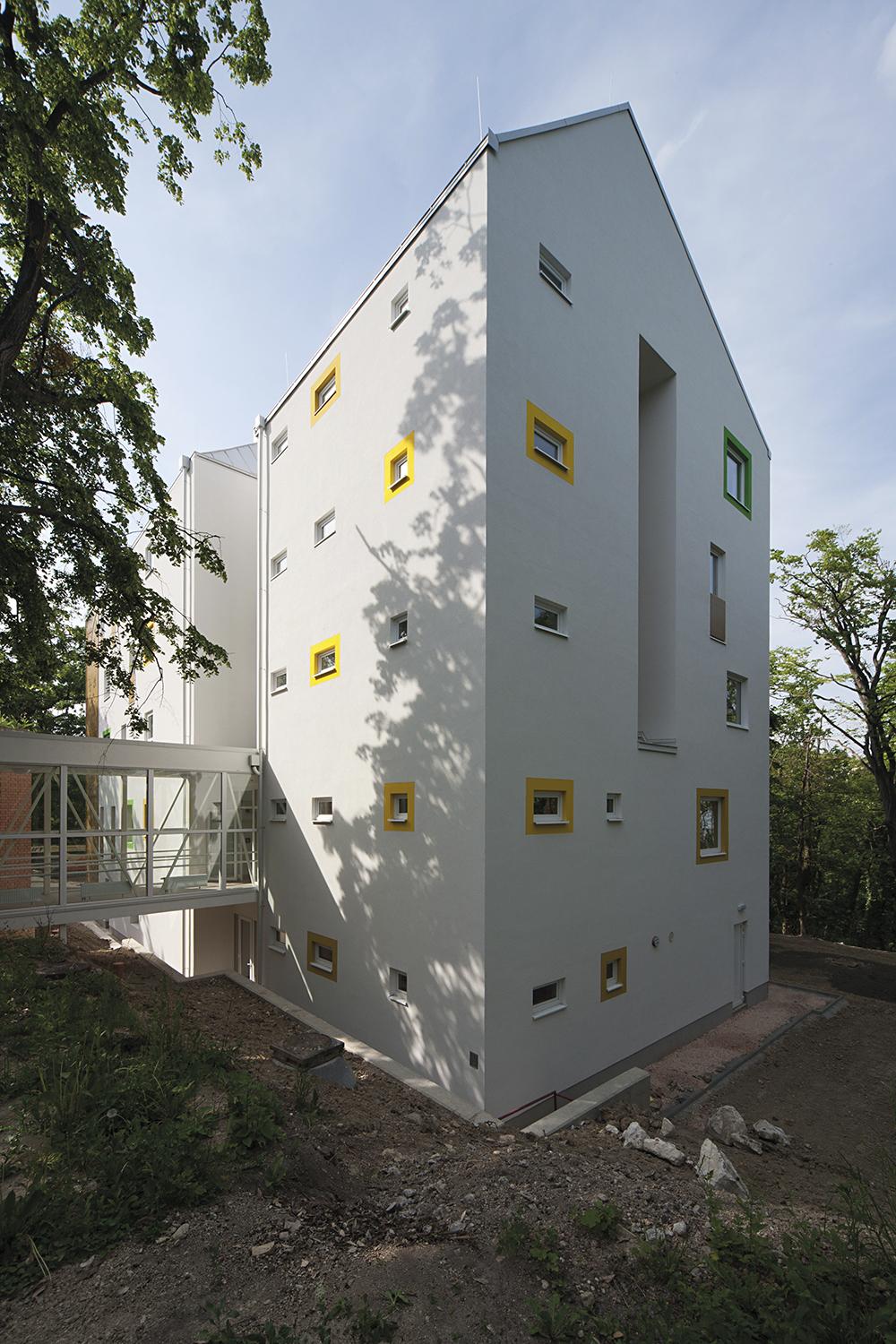 Míg a Makovecz szárny vörös téglás, alpesi tetős, és sokféle szögből és ferde tetőből összeálló bonyolult egység, az új egyszerű fehér tömbjével virít ki a zöld lombok közül. Magas téglakubus, amit a színesre keretezett, változatos ablaknyílások és az északnyugati (a külső bejárat feletti) sarok perforált rézborítása ellenpontoznak. Ami a Vasas Pasaréti úti vívócsarnokánál néhány éve híressé tette a tervezőket Kendik Gézát és az A4 Stúdiót (OCTOGON 2013/5), azaz az ottani régi, edzőtermi tömb napfényben aranyló lemezbe csomagolása, itt jóval visszafogottabban tér vissza. És funkciókkal, mert a lemezlapok Braille-írásos perforációi szűrt, de határozott fényt is engednek az épületbe (a vakokat és gyengén látókat főleg az erős fények zavarják és zavarják meg).