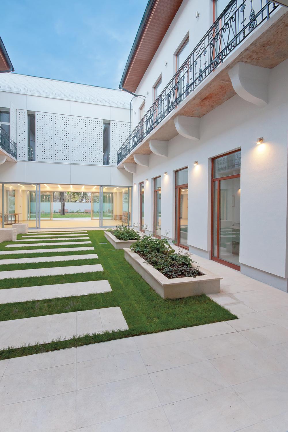Az épület határozott rendje a zöldfelületek kezelésében is tükröződik: a belső átriumot kőburkolatú sávok tagolják, a hátsó udvart széles „terasz” és geometrikus vonalvezetésű ösvény keretezi. A falikúton és a kocka-ülőkéken egyaránt feltűnik a kereszt szimbóluma, finoman jelezve a hely szellemiségét.