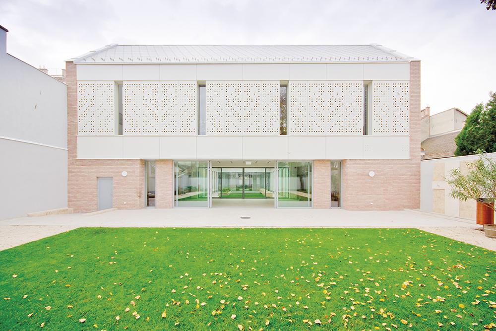 Az elnyújtott téglalap alakú telken elhelyezkedő, 1870 tájáról származó, U alakú épület udvari traktusainak kismértékű visszabontá-sával a tervezők egy új, a meglévőtől markánsan különböző keresztszárnyat alakítottak ki. Ez a nyeregtetővel fedett bővítmény rejti két szinten a plébánia sokoldalúan használható közösségi tereit. Az emeleti „nagyterem” metszetében a hagyományos házformát idézi, a letisztult, világos enteriőr kortárs szakrális tér hangulatát sugallja – bár az „igazi” kápolna a földszinti oldalszárnyban található. A homlokzatok méretes megnyitásai révén az új tömeg megjelenése átláthatóvá, rendkívül könnyeddé, szinte hídszerűvé válik – ez a földszinten, az előtérben, vagy az udvaron állva érezhető igazán. Az eltolható üvegfelületek révén könnyen létrejöhet a fizikai kapcsolat az udvarterekkel, kiváló terepet nyújtva szabadtéri rendezvényekhez is.