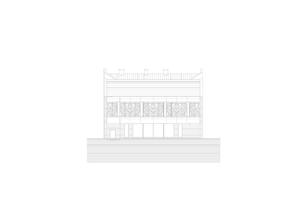 A bővítmény anyaghasználatában és a tető szerkesztésmódjában egyaránt határozottan elkülönül a történeti épülettől, a halványszürke eternitpala és a fehér szálcement burkolat tónusában viszont kapcsolódik a vakolt felületek árnyalatához. A rendezett, hátsó pihenő-udvar felé néző homlokzat peremeit az oldalszárnyak szélességében nyerstégla burkolatú felületek keretezik, finoman utalva a visszabontott traktusokra. Az emeleti nagyterem játékosnak tűnő, valójában magyaros hímzésminta szerint perforált, kihajtható árnyékoló táblái oldják a szimmetrikus elrendezés szigorúságát, időben folyton változó arculatot adva a homlokzatoknak. Ezek a terek esti használatakor „felizzó” minták jelennek meg az új szárny belső átrium-udvar felé néző oldalán, sőt a meglévő épület középső traktusán is, erősítve a régi és új kapcsolatát.
