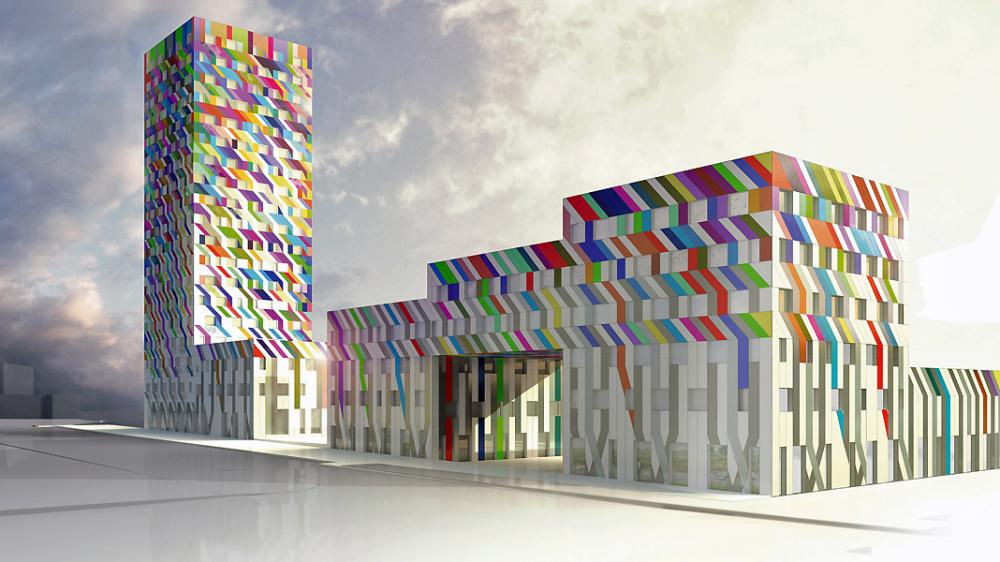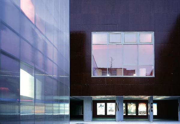 Ebben a projektben az anyagi keretek rettenetesen szűkösek voltak, tehát nem volt pénzem arra, hogy homlokzati anyagot, mint olyat használhassak. Csak a festéssel dolgozhattam. A homlokzat nyers beton, egyszerű zsaluzással, majd lazúrral belakkozva. De a lazúrt utána átszíneztem, ami lakkos hatást kelt, s ez nagyon fényes felületet eredményez, amit én nagyok szeretek használni. Ehhez még jön egy kis bíbor tónus, egy kicsi violaszín. És hát mindez, valóban, a projektnek nagyon különleges, kifinomult jelleget kölcsönöz, és közben szinte semmibe nem kerül. Nagy hatást kelt a büdzsé méretéhez képest. Tehát azért akartam a bíbort használni, mert számomra ez a szín jelképezi a színházat, és azért is, mert gyakran találkozunk vele az északi országokban, ahol sokat használják a téglát, és annak minden árnyalatát: gesztenye, okker, viola, barna stb. Tehát lehetővé tette, hogy gesztust tehessek a színház felé. Mivel ez egy hatalmas projekt volt, legalábbis a környék léptékéhez képest, ahol csak kétszintes kicsi házak vannak, grafikai szempontból meg akartam dolgozni ezt a festést. Ez alkalom volt arra is, hogy grafikailag tudjak dolgozni a projekten, hogy a felületeit kicsit absztraktabbá tehessem, legalábbis megbonthassam a kolosszális méreteket, az épület ugyanis 22 méter magas. Minden rombusz hatalmas, kb. 10-12 méter magas. Így sikerült megtörni a méreteket, s a színekkel is dolgozhattam. Tehát ott van a bíbor, a fekete, és ezen kívül még kicsi fehér pontok is, fluoreszkáló festékből, mivel nem volt ezüstünk a régi stílusú világításhoz. A színház ugyanis sokat él éjszaka, tehát egyszerűen ott vannak ezek a kis fehér pontok, melyeket ezen a szürkületi fotón nem láthatunk, éjszaka viszont, amikor feltűnnek, csak a fehér pontok látszanak.