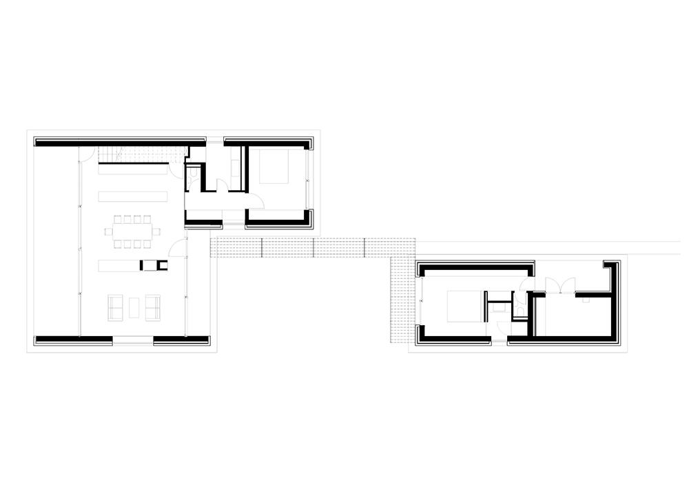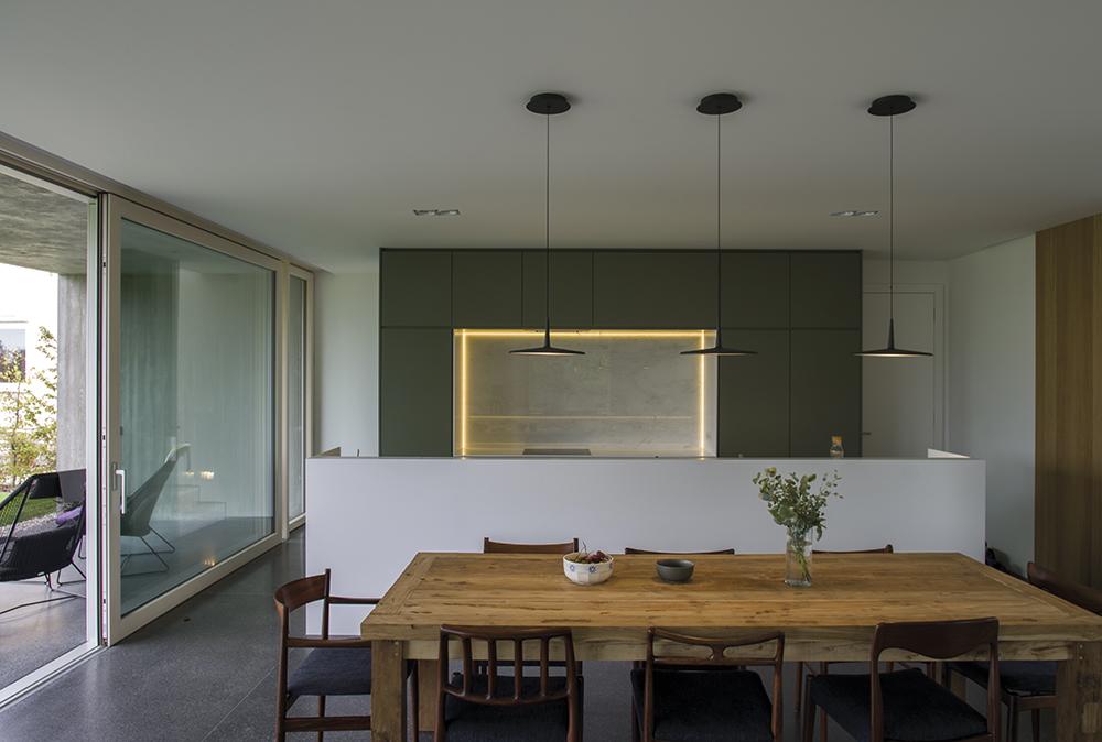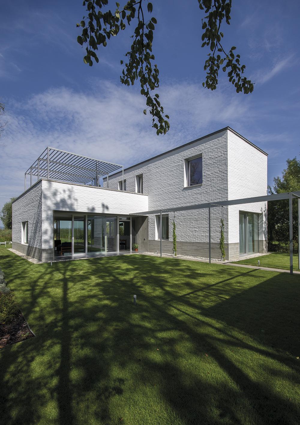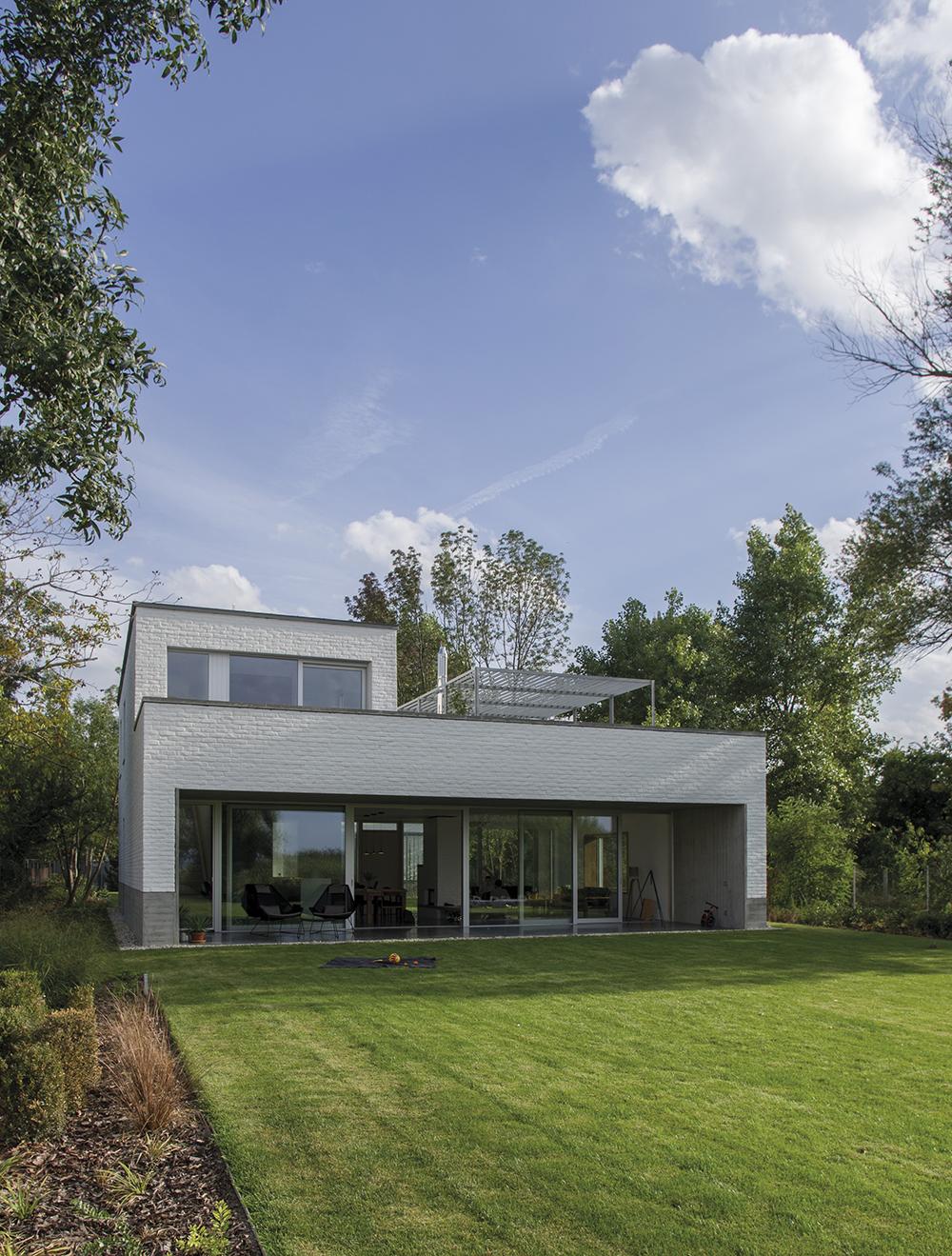 Eleganciája az építészet és a belsőépítészet harmonikus egységében érhető tetten: a beltéri burkolatok finoman átfolynak a kültérre, a betonlábazaton lebegő, fehérre meszelt bontott téglastruktúra a nappaliban újra feltűnik: a kandallót építették bontott téglából és festették le szintén fehérre, ezáltal is erősítve a kint és a bent egységét. Az épület nem csupán megjelenésében, de működésében is alázattal viselkedik környezetével szemben, egyfajta nyitott kompozícióként találva meg helyét a természetben, mellyel szoros kapcsolatot ápol.
