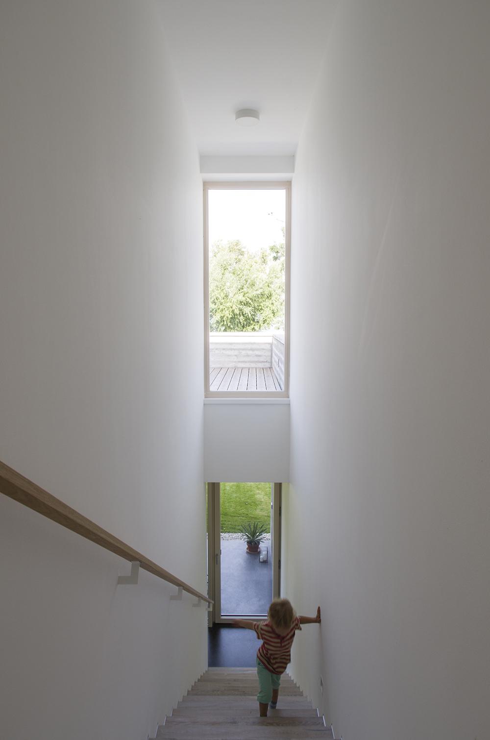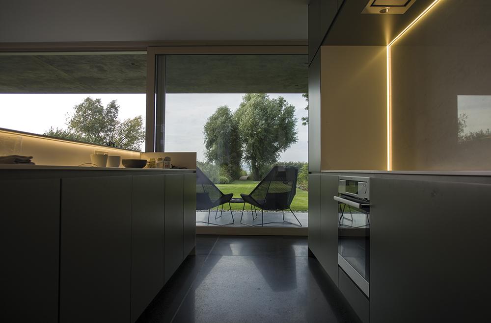 Az építészeti forma jellemzésére talán a rejtőzködés a legjobb kifejezés, olyan, amelyben az intim szféra komoly hangsúlyt kap. Szinte alig kommunikál ez a ház az utcával, nem sok teret enged a járókelők kíváncsi tekintetének. Ez a fajta visszahúzódás természetesen azonnal felkeltette a környéken élők érdeklődését, olyannyira, hogy a helyi teniszklubban is téma, hogy vajon ki lakik abban a Balaton-parti kockaházban, ami olyan sokáig épült, és amúgy is, mit lehet egy házon ennyi ideig építeni? Én persze tudom, hogy a ház csak akkor volt kész, mikor minden apró momentum a helyére került. Az apró részletek kivitelezése, a belsőépítészeti munkálatok a kívülálló számára láthatatlanul zajlottak. Nem volt cél a hivalkodás.