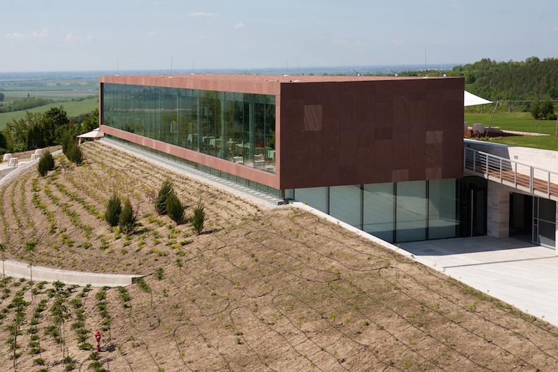 Nyúl, majd Écs községét elhagyva, ahogy a Pannonhalmi Apátsághoz vezető szerpentinen kapaszkodunk fel, egy szelíd, csokiszínű épület hasal az útmenti földnyalábon. Öntözőrendszer fekete hurkái kanyarognak a csupasz dombon, egészen az épület tövéig, mely a világörökség felé tartó út forgalmát szürcsöli fel.