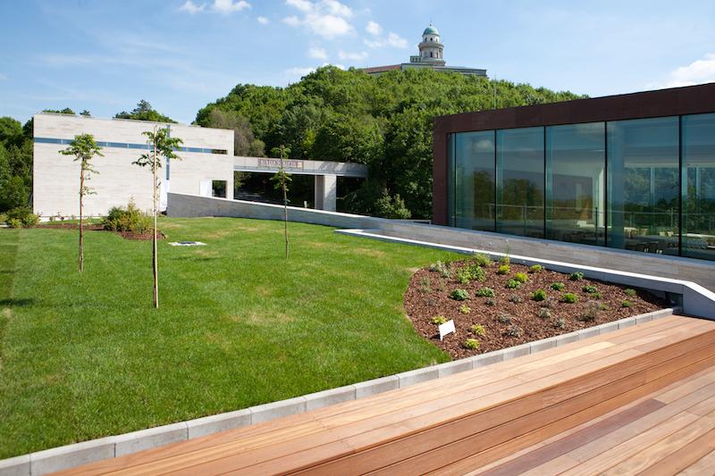 A földnyaláb gyomrába rejtett parkoló, melyet egyedül a domb köré gyengéden beívelt út jelez, kerékpárok és nagyobb gépjárművek elszállásolására is alkalmas, így a kötelező turistabuszok füzére nem tolakodik a tájba. A parkolóból az épület hátsó, teraszos traktusán sem érzékelünk semmit, mely a homlokzati képtől merőben eltérő karaktert mutat.