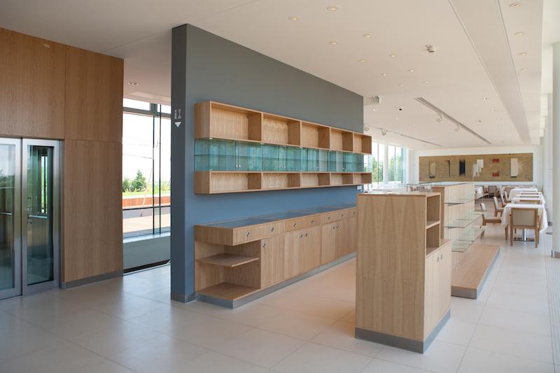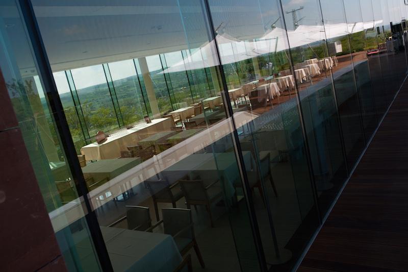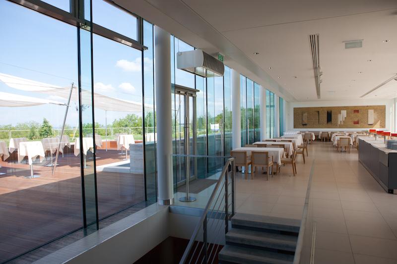 A fegyelmezett utcafront mögött ugyanis a csuha alól hófehér alsószoknyák hada villan ki, hatalmas napernyők képében. Egy-egy ilyen automatizált szoknya a szél mozgását érzékelve terül ki vagy gubózik öszsze, a pannonhalmi égbolt kegyelmére bízva bennünket. A teraszon működtetett szűzies árnyékolók nem csak a bangkirai fával borított pihenőterasz tökéletes kiegészítői – az elkölteni kívánt ebéd és a Pannonhalmi Apátsági Pincészet termékeinek házasítása mellett igen komoly esküvői turizmust generálnak. Az étterem belső tere ellensúlyozza az egymást váltó násznépek nyüzsgését, mely lágy vákuumként viselkedik. Az épületen körbefutó üvegbordázat ugyanis mindent megmutat a tájból, mégis valamelyest eltávolít attól. Az üveghomlokzat mögött fehér oszlopsor vonul végig, mely alig észrevehető idézet a karnyújtásnyira ülő apátság harangtornyából. A világörökségi panoráma elé így egy értő lencse kerül, melynek legnagyobb erénye visszafogottságában rejlik.