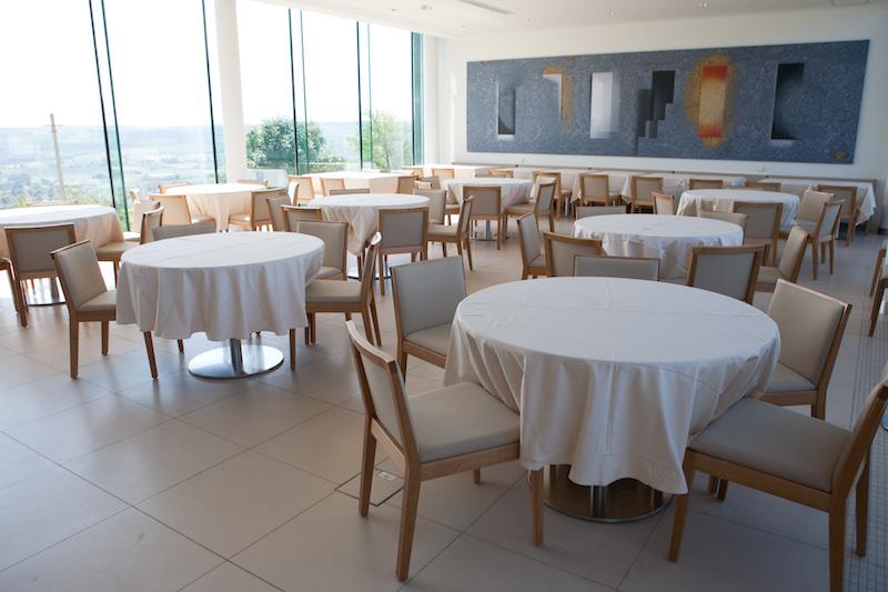 A barna csuhás, tiszta tekintetű épülettömb szerzetesi fegyelemmel mutat a fogadóépület kapuzata felé, melyet a hátsó terasz rábillentése erősít meg. Az étterem, konferenciaterem, illetve parkoló hármas funkcióját ellátó építmény nem fél kiszolgálni a Skardelli tervezte szomszédos architektúrát: a római travertin mészkő burkolat ismétlése, illetve a mértani idomok következetes alkalmazása egységben kezelik a turisztikai élményt terelő épületeket. Az információs bázisként szolgáló kapuzat, mely az Apátsághoz vezető meditatív séta nyitánya, így alapvető szolgáltatói funkciókkal bővül.