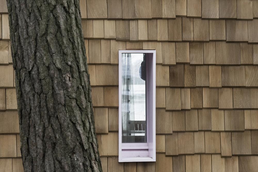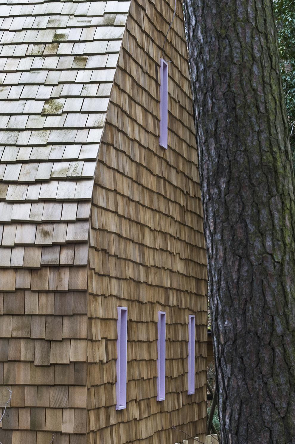 Szót kell még ejteni a ház külső burkolatáról, hiszen a tetőszerkezet szinte észrevétlenül alakul át oldalfallá, nincs egyértelmű határvonal, az egyik funkció átúszik a másikba (a hullám-imitáció impozáns válasz a víz mozgásformájára). A külső faburkolat szintén a teljes épületet lefedi, egyfajta fazsindelyes megoldás, amely a környező fák kéregszerkezetének retorikáját viszi tovább. Nem csupán befed, hanem a ház megfelelő hőháztartását is elősegíti, hiszen nyáron a környező fákkal együtt természetes védelmet nyújt a közvetlen napfény ellen.