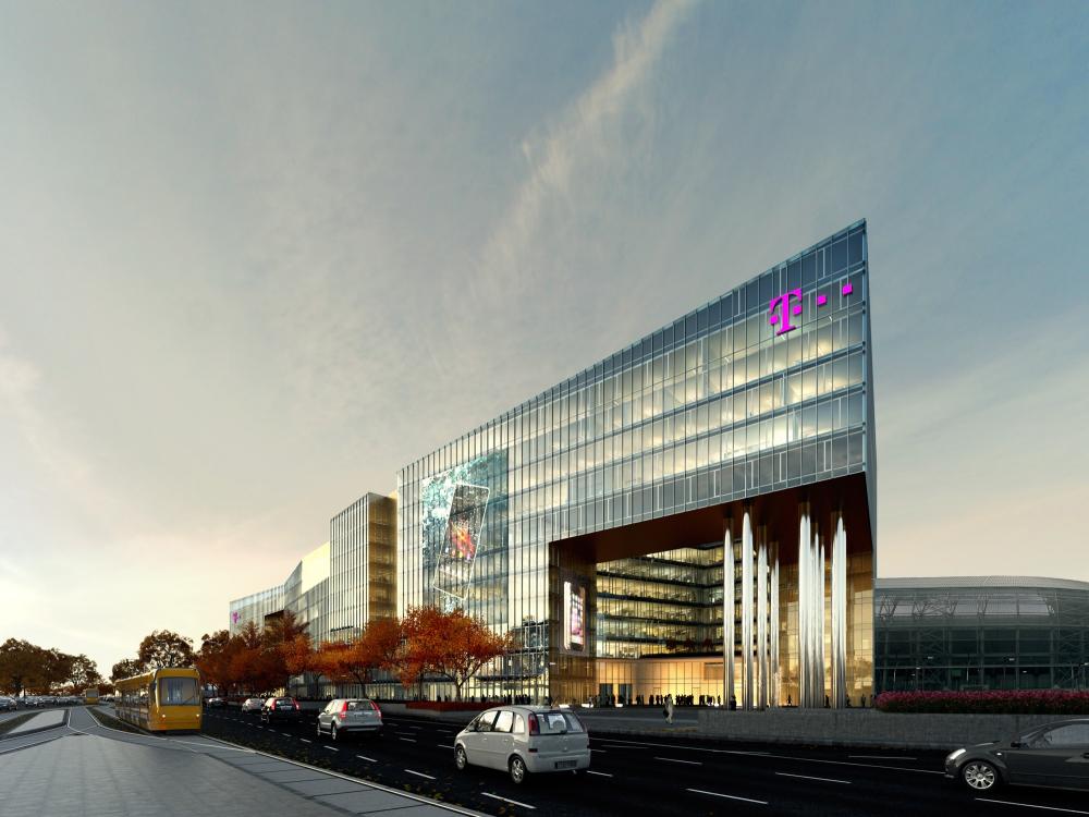 A Groupama Arénával szomszédos Magyar Telekom székház alaprajzi kontúrját – mely a telek formai, méretbeli adottságaihoz is viszonyul – úgy rajzolták meg a tervezők, hogy a két épület egyedi karaktereik mellett harmóniában, kompozícióban létezzenek egymás mellett. A székház Könyves Kálmán körút-Üllői útra néző homlokzatára kerül a Telekom székház impozáns főbejárata, a körút-Albert Flórián úti sarokrészen pedig egy másodlagos gyalogos bejáratot találunk majd, mindkettő akadálymentesített. Az oszlopcsoportokkal bevezetett bejárati szakaszok kikönnyítik -, s hasonlóan a begyűrődésekkel kialakított, dinamikus homlokzatokhoz - egyértelműen oldják a méretből eredő monotonitást. Összességükben kristályszerű megjelenést kölcsönöznek az irodatömbnek, ezt a kristályszerű képet fokozza az egyes épületrészek változó épületmagassága, azonban egyik magassági pont sem közelíti meg a helyi szabályozásban rögzített 45 méteres maximumot. A kikönnyítésen túl, a főbe - járatnál a 22 méter magas oszlopok által egy önálló, tágas városi köztér jön létre, és az épület körüli gondozott, zöld környezet révén tovább bővül az új, rendezett, ápolt fővárosi közösségi területek aránya.