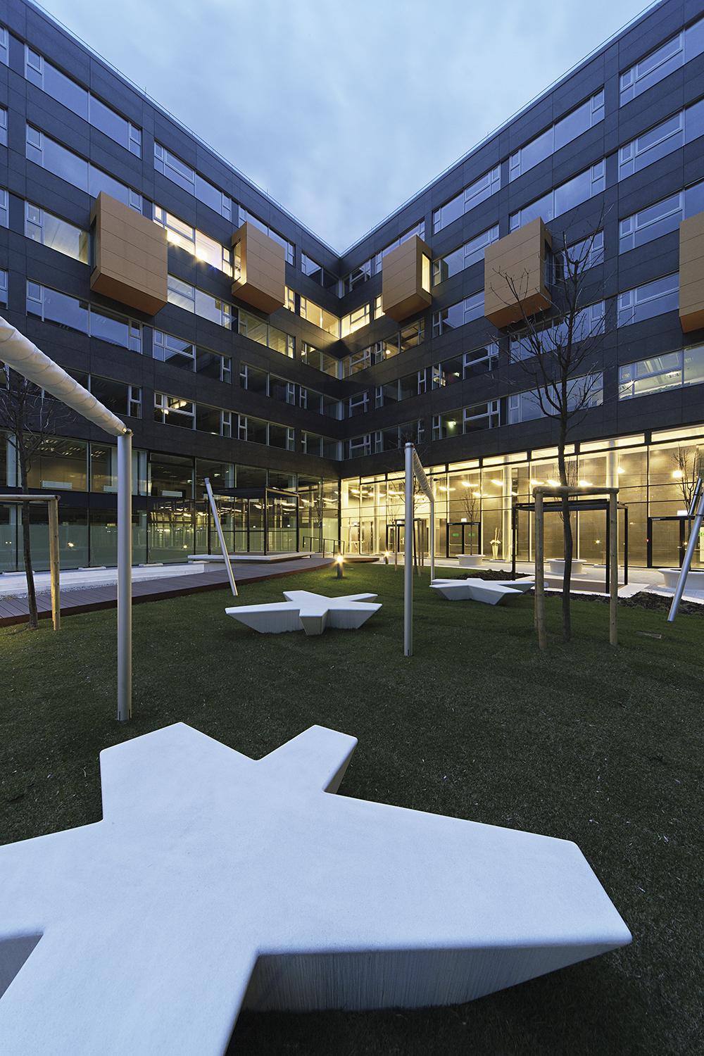 A kompakt tömegképzés az energetikai szempontok mellett a megrendelő letisztult skandináv szemléletét tükrözi, amelyet a tervezők – Asa Haremst, Anders Svennington (White Arkitekter), és Pintér Tamás (DPI Design) – öntöttek végleges építészeti formába. Az utcák vonalához igazodó, U alaprajzú épület belső udvarával dél-délnyugat felé, az óvoda irányába fordul; a helyiségek a telepítésnek köszönhetően minden irányból kedvező természetes megvilágítást kaphatnak.