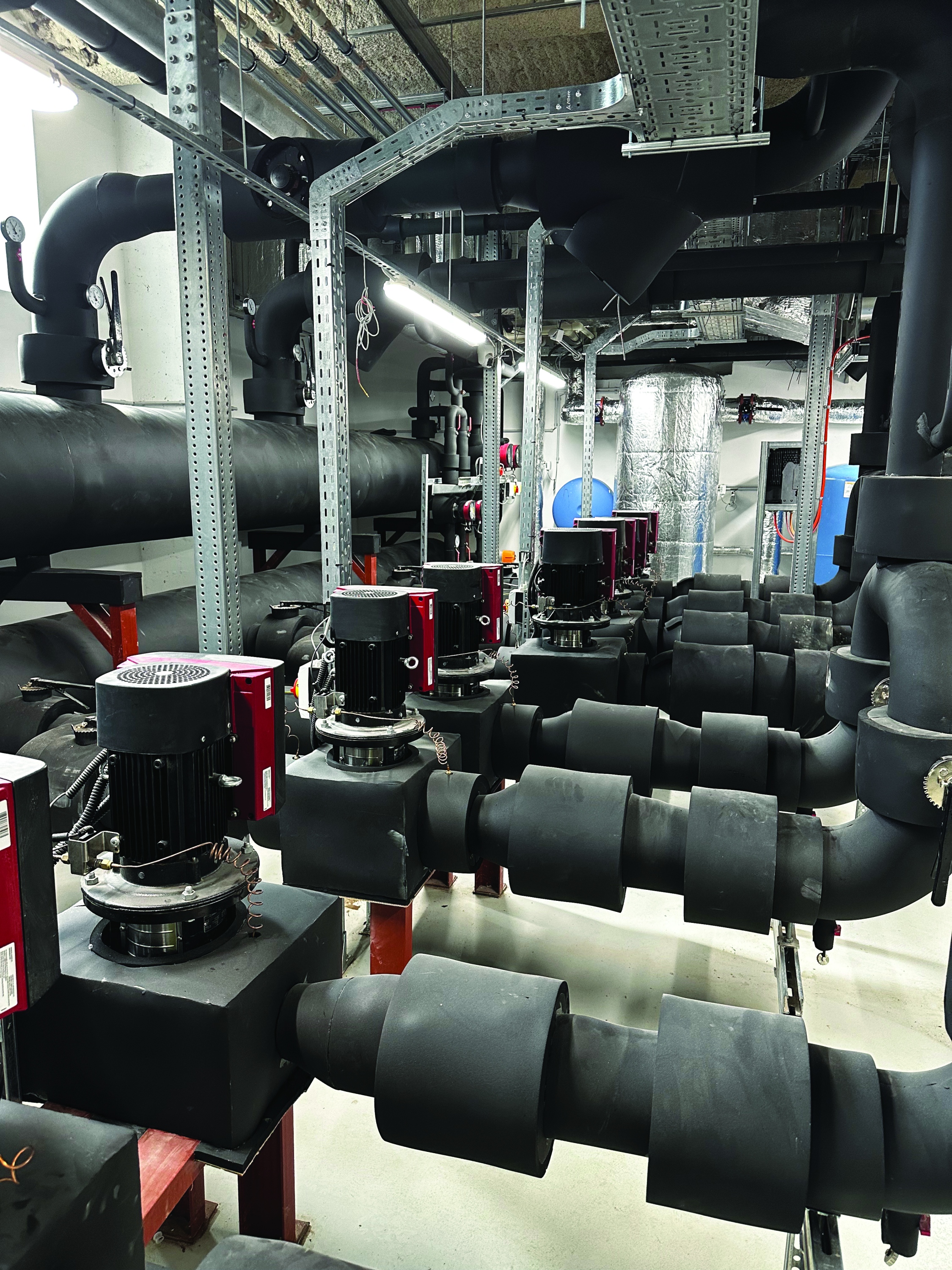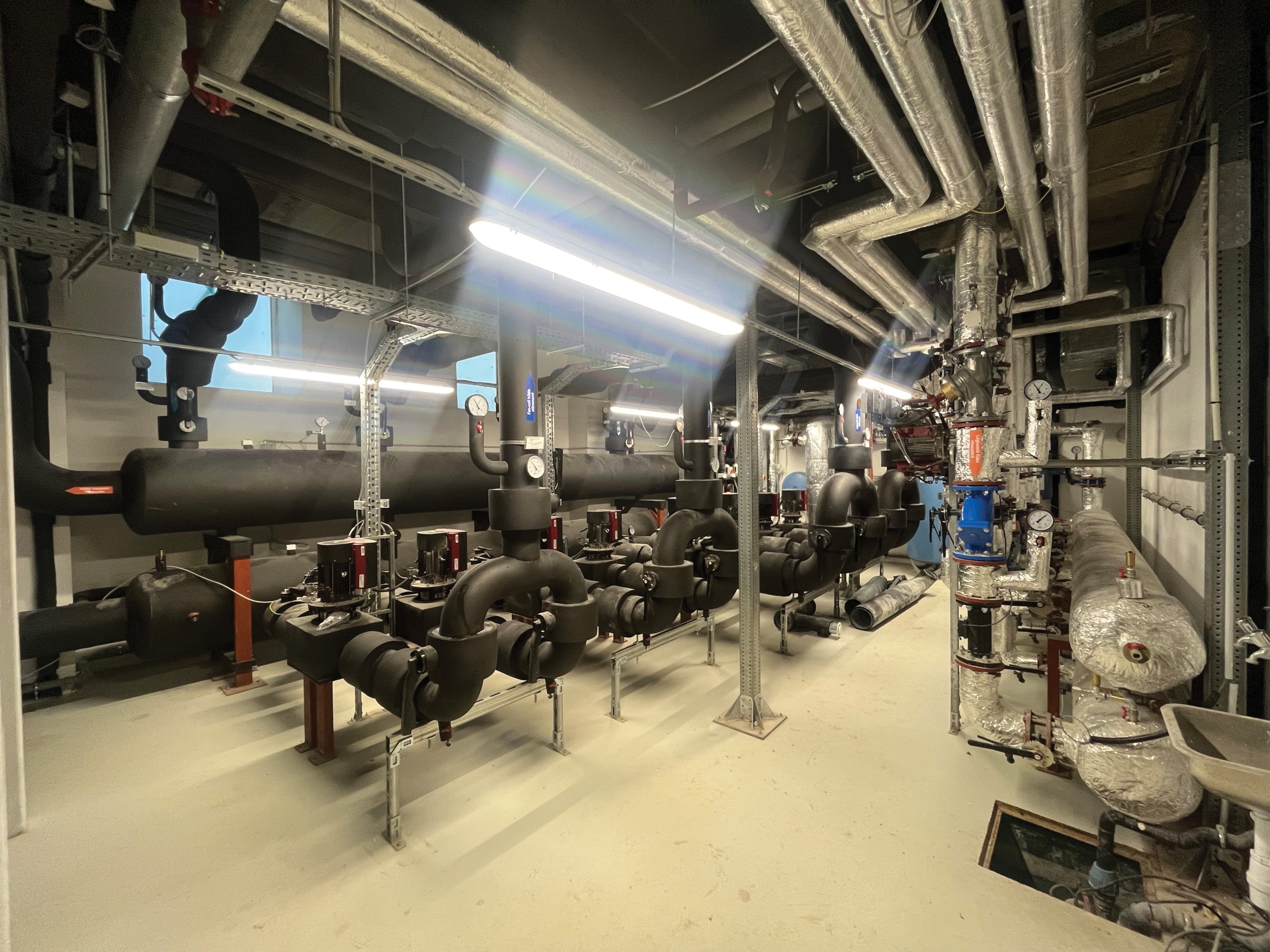 Az épületek friss levegő ellátását forgódobos hővisszanyerős légkezelők látják el, a hűtési energiát pedig folyadékhűtők biztosítják, ezek a berendezések mind a tetőn kaptak helyet. Fűtési energiát távhő szolgáltatás látja el.
