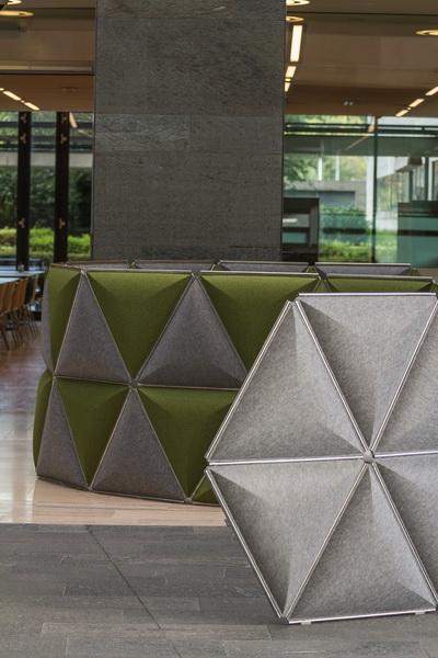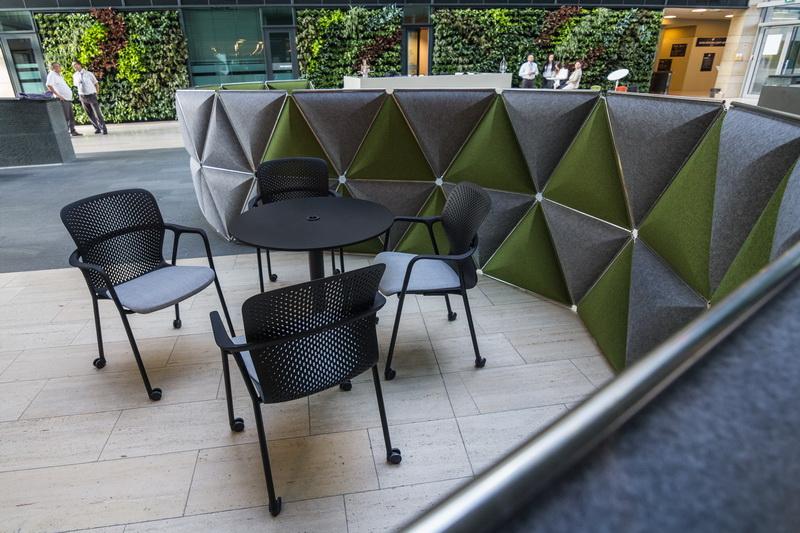 A Római Irodaház impozáns, nagyvonalú központi auláját és a hozzá kapcsolódó közösségi tereket – az éttermet, a kávézót és a coworking irodát úgy alakították át, hogy az a belső munkatársak és a kívülről érkező vendégek számára is jól használható legyen. Pálla Gábor, a Római Irodaház ügyvezető igazgatója kiemelte, hogy az új elrendezésnek és berendezésnek köszönhető új funkciókkal – a tárgyaló- és várakozószigetekkel, coworking munkahelyekkel – a belső kommunikációt és kollaborációt szeretnék életre kelteni. A korábban kihasználatlan aulában a Herman Miller modul elemekből álló Kivo akusztikus, S alakú paravánja kapott helyet, két görbületében egy-egy tárgyalószigettel, a Herman Miller Swoop foteleivel és Keyn görgős tárgyalószékeivel. A várakozás percei hasznosan tölthetők a kényelmes ülőbútorokban, hiszen a tárgyalóasztal csatlakozási lehetőséggel is ellátott.