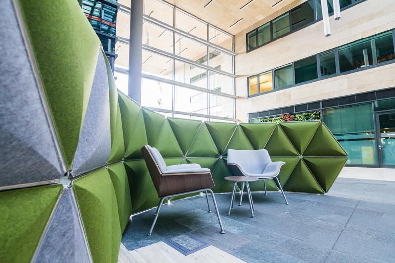 Az MVM fenntarthatóságot előtérbe helyező zöld filozófiáját a recepció mögött kialakított hatalmas zöld fal jeleníti meg a központi térben, előtte élénk, és hívogató színfoltot nyújtanak a Wilkhahn színes Stand Up támaszkodó székei. A dolgozói jólét érzésének a növelésére új éttermi berendezést alakítottak ki, az aulához közeli résznél bárasztalokat és bárszékeket helyzetek el, amelyek ebédidőn kívül is alkalmasak rövid pihenőre és beszélgetésekre. Ugyanígy a kávézó megújult terében is lehet egy kávé vagy üdítő mellett dolgozni, az elektromos csatlakozókkal ellátott asztalok mellett. A coworking iroda speciális munkahelyeit a belső munkatársak, a tagvállalati munkatársak és a vendégek is igénybe vehetik. A falak szőnyegekkel fedettek, a bútorzat internet és erősáramú csatlakozókkal is ellátott, így a nyugodt térben egyaránt folyhat elmélyültebb munka vagy gyors megbeszélés. A tevékenységekkel, élettel megtöltött közösségi tereket barátságossá teszik a minden helyiségben megtalálható zöld növények.