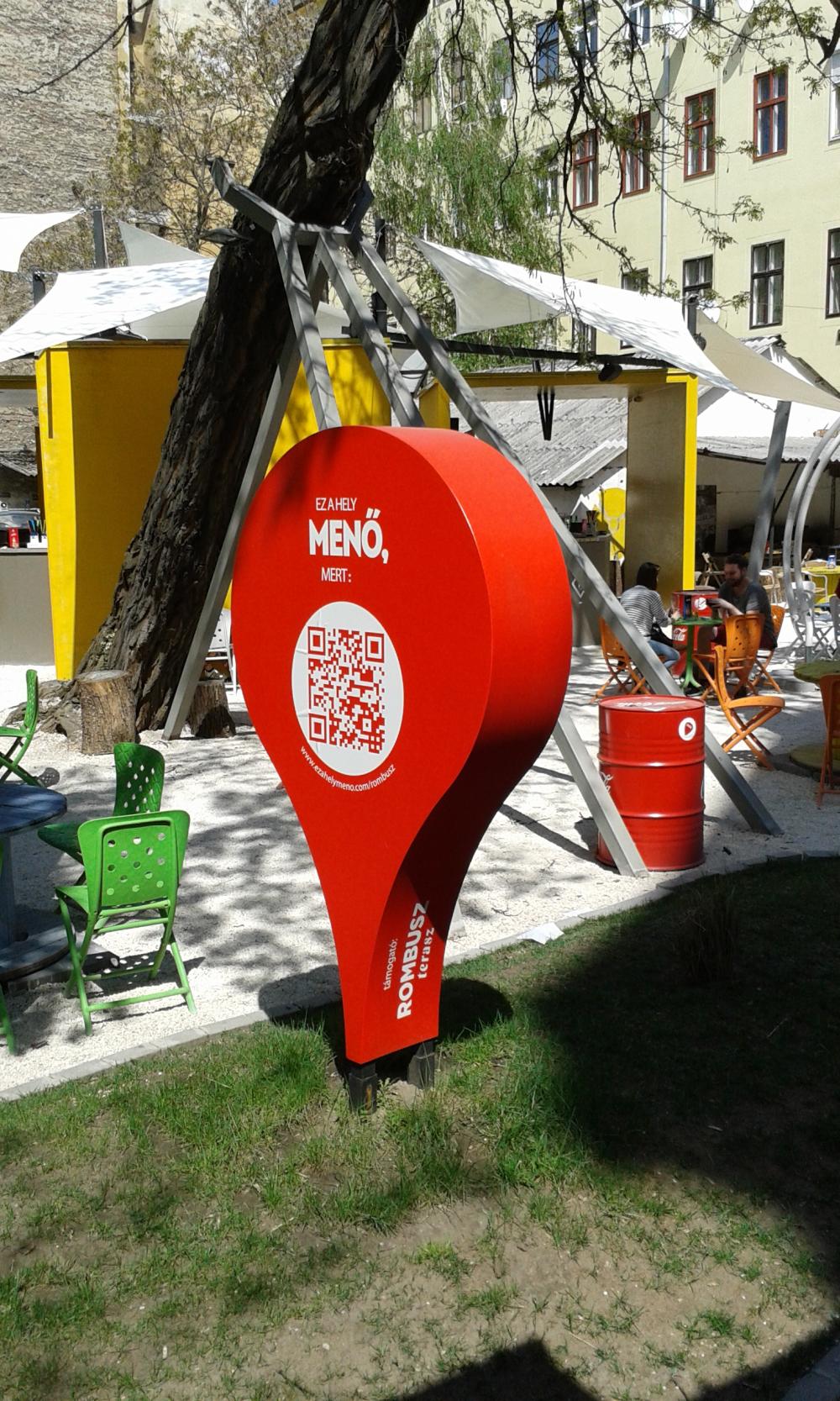 Erzsébetvárosi helyszínnel bővül szombaton az Ez a hely MENŐ! nevű, interaktív városi jelölőhálózat. Ezúttal a bulinegyed szívében, a Kazinczy utcában, a Szimpla Kertben kerül ki egy QR-kóddal ellátott, embernagyságú, piros térképtű. A projekt célja rámutatni azokra az épített értékekre, amelyek a szó átvitt vagy valós értelmében el vannak rejtve a szemünk elől, például azért, mert valami eltakarja őket, netán mert az évek alatt megváltozott a funkciójuk.
