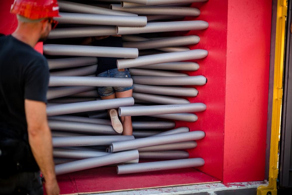 A PLEASURE FACTORY egyes részei a különböző érzékekre hatnak. Az első konténer a zsúfolt fesztiválélményt imitálja. A látogatóknak szivacstenger-erdőn és tengernyi színes szivacslabdán kell átverekedniük magukat, mintha a Nagyszínpad előtt állnának. Az élményt fokozza az ipari ventillátor szélcsatornája, ahol az ember egész teste lobogni kezd. A következő konténer a tapintást és a hallást élesíti fel: a hangraktárban mindenféle felületek és tárgyak között lehet lépkedni, turkálni, aztán az ipari orgonán zenét is lehet komponálni.